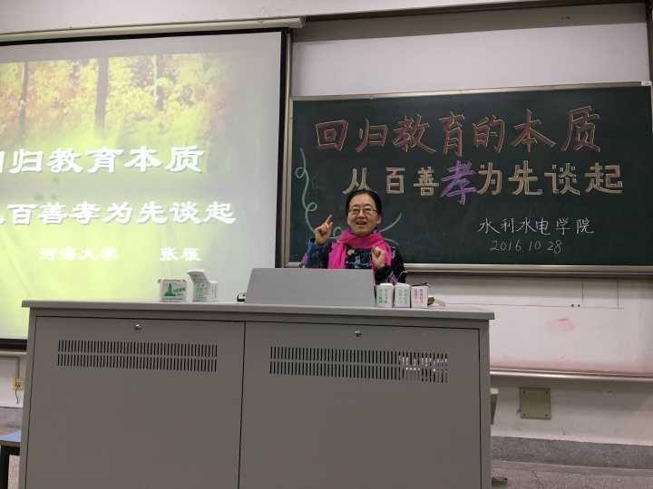 张雁老师首先讲述教育面临的问题。她认为现在员工缺少“由知转为行”的能力,行动力太差,提出“光有知识还不行,知行合一才是大智慧”的观点。她引用“天下熙熙皆为利来,天下攘攘皆为利往”,阐述中国人幸福指数下降,教育、住房、医疗三座大山压得人们喘不过气来的现实。之后她告诉新生们成功是有道理的,它要求人学会做人做事。以俞敏洪为例,大学四年他无怨无悔为室友打水,毕业后,大学同学毅然决然从国外回来支持他创业。当然,孝顺是做人做事的基础,让同学们观看一段视频,聆听歌曲,在潜移默化中向员工们传达“学会感恩,不要觉得父母所做的一切都是理所当然”的道理。常与父母联系,不要让爱断根。最后,同学们全体起立观看《跪羊图》视频。树欲静而风不止,子欲养而亲不待,告诫学子们珍惜与父母在一起的时光。下午5:30,讲座圆满落幕。
