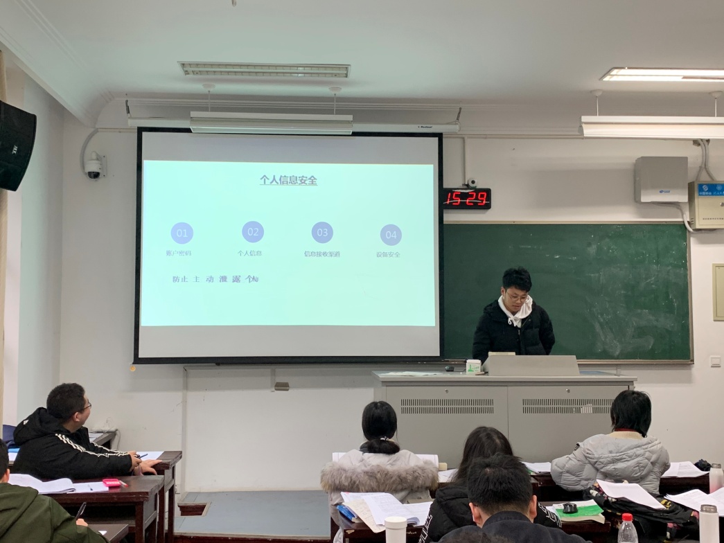 1月3日,2016级水工四班举行“安全大于天”主题班会。班会结合公司安全教育的需求,就网络诈骗、盗窃偷窃、网络言论、违章电器、禁止黄赌毒等内容进行了宣传教育,上紧了同学们心中的“弦”,明确了不可触碰的底线。