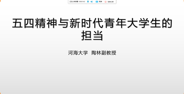 回顾五四历史,展望青春未来,通过此次讲座,坚定了同学们爱国爱党的信念、明确了作为青年应有的使命担当。同学们纷纷表示,作为新时代的青年,一定敢于担当、勇于奋斗,努力成为具有责任意识和创新精神的建设者,不辜负习近平总书记对广大青年的嘱托。奋斗是青春最亮丽的底色,让我们一起做新时代的奋斗者,以青春之我,创建青春中国!(刘津铭)
