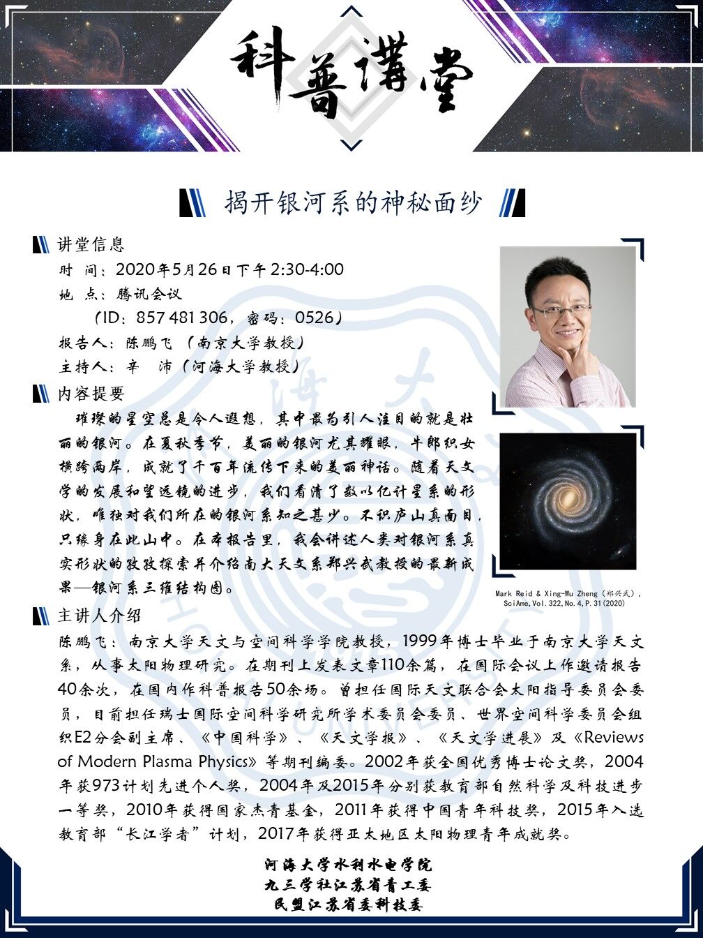 报告人简介:陈鹏飞,南京大学天文与空间科学公司教授,1999年博士毕业于南京大学天文系,从事太阳物理研究。在期刊上发表文章110余篇,在国际会议上作邀请报告40余次,在国内作科普报告50余场。曾担任国际天文联合会太阳指导委员会委员,目前担任瑞士国际空间科学研究所学术委员会委员、世界空间科学委员会组织E2分会副主席、《中国科学》、《天文学报》、《天文学进展》及《Reviews of Modern Plasma Physics》等期刊编委。2002年获全国优秀博士论文奖,2004年获973计划先进个人奖,2004年及2015年分别获教育部自然科学及科技进步一等奖,2010年获得国家杰青基金,2011年获得中国青年科技奖,2017年获得亚太地区太阳物理青年成就奖。