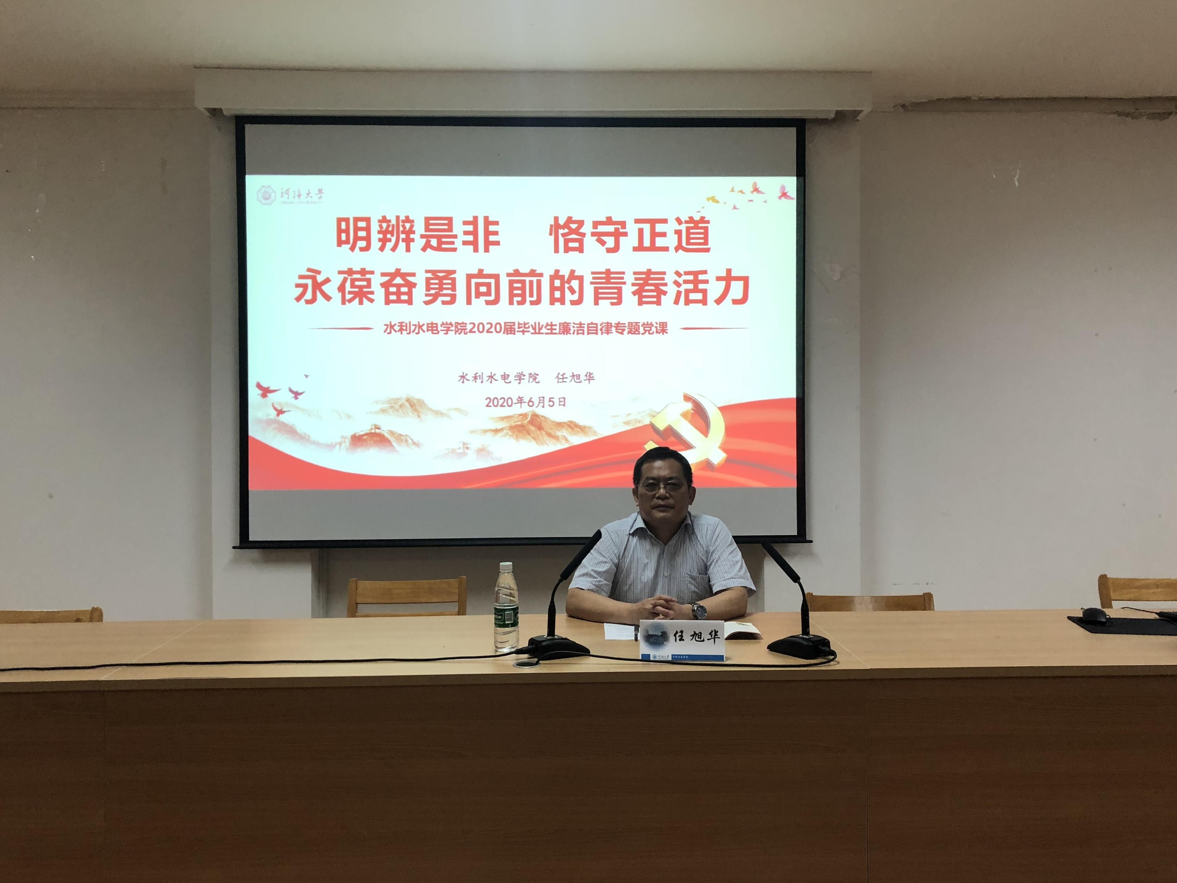 6月5日,公司党委书记任旭华以《明辨是非,恪守正道,永葆奋勇向前的青春活力》为题,为全体2020届毕业生讲授廉洁自律专题党课。此次党课以线上线下相结合的方式举办,毕业生党员共126人在水电馆401会议室参加党课,毕业研究生和本科毕业生共253人在线上收听党课。