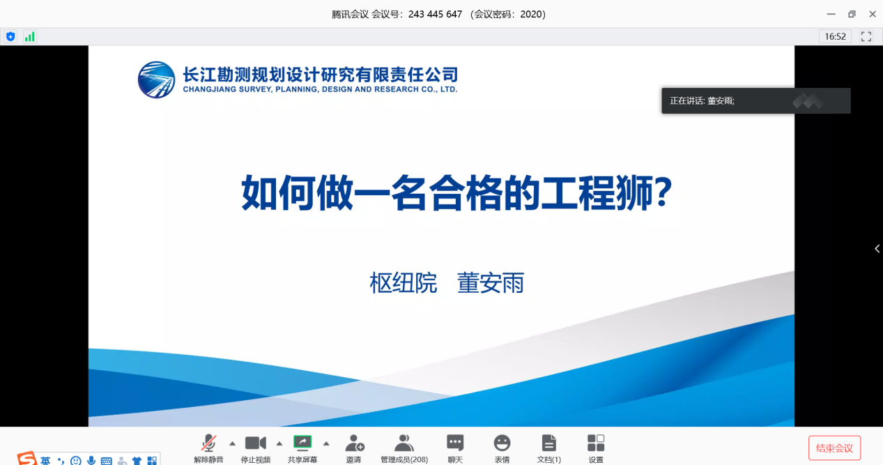 员工董安雨以《如何做一名合格的工程师》为主题,首先对水利水电工程的就业方向进行介绍,并且将设计院的方向作为主线,介绍了工程师的日常。董安雨员工特别提到在工作上前期是一个打基础的阶段,要调整好心态,还需要保持高度的学习热情。随着市场饱和,设计院更需要“一专多能”的人才,此外除却传统工程师本行业发展方向还有BIM设计师、市场经营人才等。