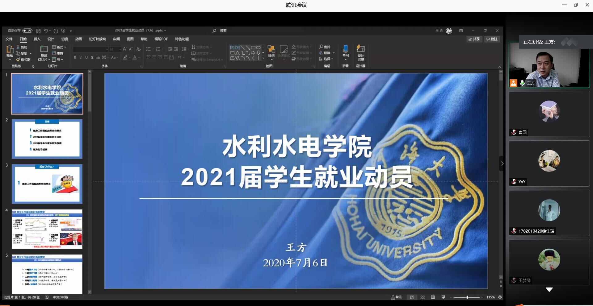 王方副书记介绍了当前就业工作面临的形势和要求,分析了20192020届毕业生就业情况。他强调,行动迟缓是老员工就业存在的突出问题,2021届毕业生应尽早明确生涯发展目标,规划就业方向,认清当前形势,调整就业期待,提前做好准备。王方副书记寄语全体员工以高标准严格要求自己,在暑期合理规划时间,安排学习计划,迎接新学期的到来。