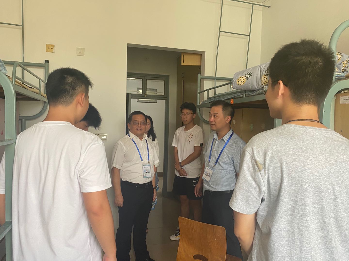 任旭华书记一行来到员工宿舍,查看了新生宿舍基础设施、环境卫生等情况,并深入寝室与同学们亲切交流。任书记代表公司欢迎新同学的到来,亲切询问同学们第一次离开家乡的感受、对今后老员工活的期待等,希望同学们能尽快适应大学集体生活,遵守公司的相关规定。当看到宿舍同学带有《水工结构工程》书籍时,对同学们提前接触专业知识的做法表示鼓励,期待同宿舍同学一起进步,在大学四年共同努力。