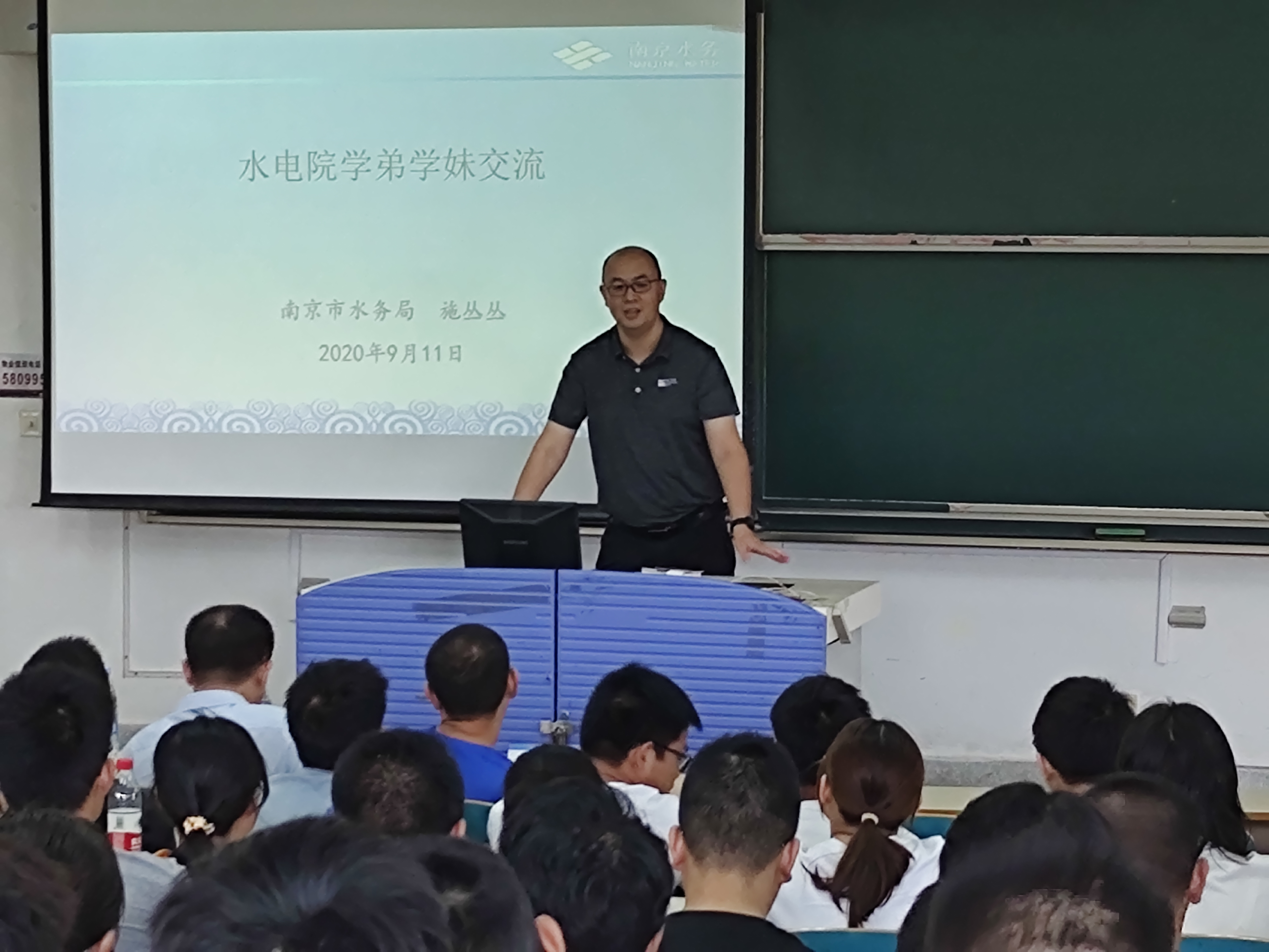 员工施丛丛以水工专业学长的身份,从水工专业的就业选择、水工就业前景、水利需要什么样的人、大学学习生活的几点建议四个方面,与学弟学妹们分享了自己的学习、工作经验。施丛丛员工特别提到在近期洪涝情况下,国家为做好水灾害防御,解决水环境水生态问题,对水利行业具有较高需求,水工专业就业前景极为广阔,并在国家发展中具有重要地位。
