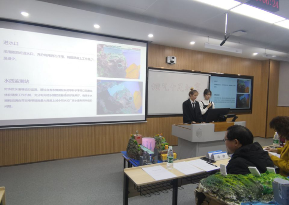 答辩于4:30在致用楼218、318、418三个教室正式展开,参赛选手按照顺序依次上台答辩,展示团队精心制作的大坝模型,讲解大坝的创新点及工作原理,一展风采。评委老师们对选手的想法产生浓厚的兴趣,答辩结束后进行了交流和沟通,同时也详细地给出自己的专业建议。