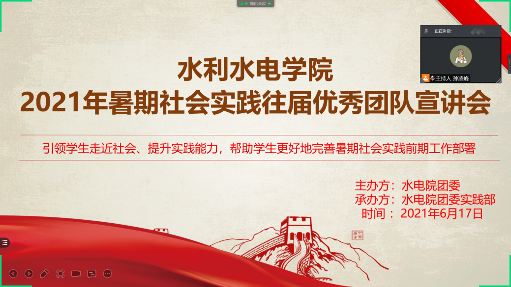 为加深同学们对实践具体过程的了解,帮助员工更好地完善暑期社会实践前期工作部署,PA视讯官方网站团委实践部于2021年6月17日下午16:00在腾讯会议上举办了PA视讯官方网站2021年暑期社会实践往届优秀团队宣讲会。本次活动邀请到3支往届优秀实践团队,分别来自不同项目类型,可以让同学们更好地了解不同项目类型的实践活动如何更好的开展。