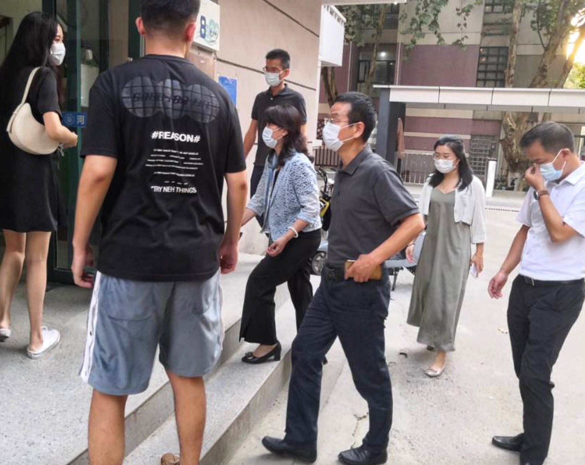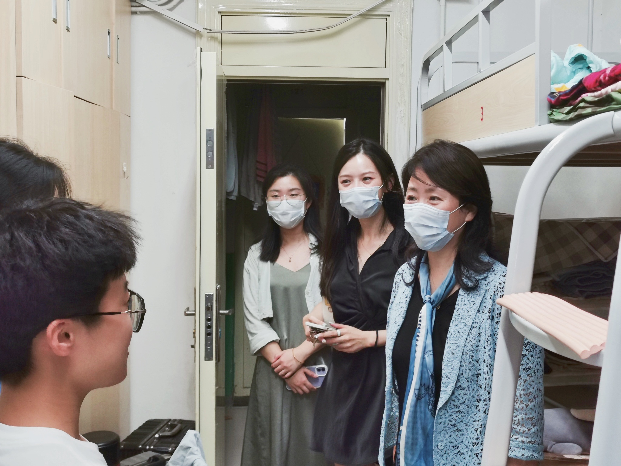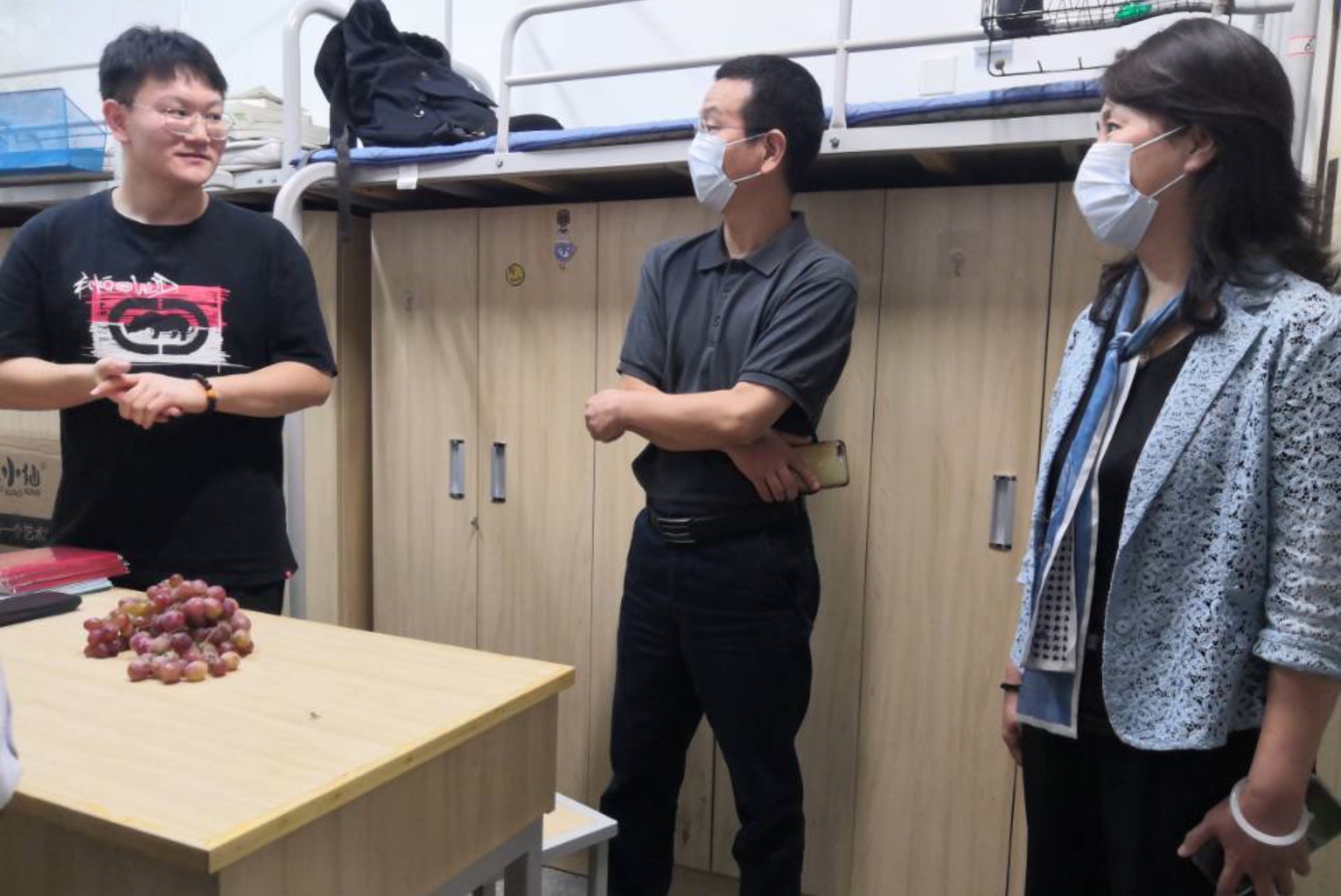 22日,老生返校当天下午,我院党委书记娄健、经理王媛、副经理王建、党委副书记王方来到西康路校区员工2舍、8舍、新疆馆,走访慰问已返校的2018级、2019级本科生。2018级辅导员姜帆、2019级辅导员帅雨婷陪同走访。