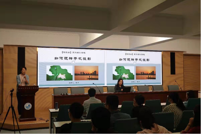 皓月老师采取教学互动、理论与实践相结合的形式,生动形象地讲解了构图基本原理、摄影技巧、后期处理等内容,从光圈、快门速度、感光度等基础知识着手,由浅入深地分享了专业的拍摄技巧,还结合典型案例具体分析了会议照片的拍摄方法,最后对如何提升同学们的摄影技术提出了宝贵的建议。