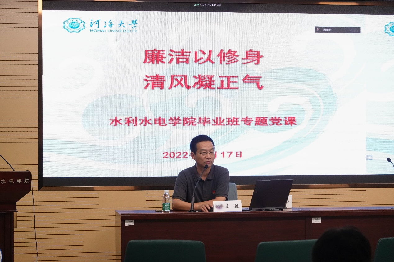 6月17日,我公司党委书记娄健以《廉洁以修身,清风凝正气》为题,为全体2022届毕业生党员讲授廉政专题党课。党课由公司党委副书记王方主持,全体毕业生党员在水电馆301会议室和腾讯会议线上线下同时参加学习。