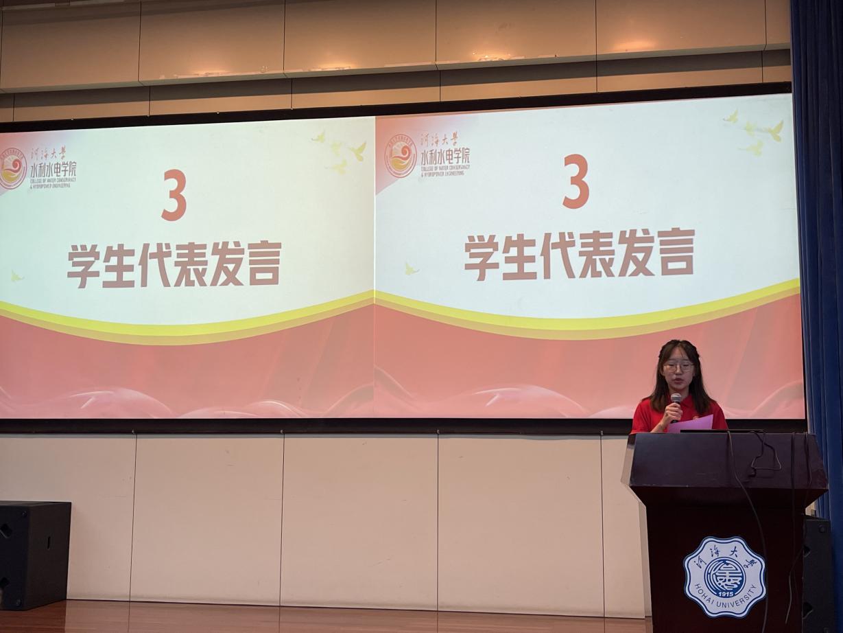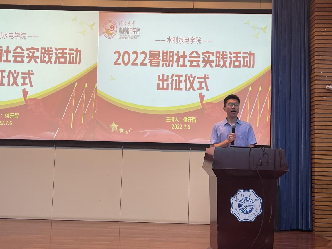 校级团队代表范译轩同学发言,讲述了此次即将参与“三下乡”暑期社会实践活动的意义和感受,时刻铭记“献身、求实、负责”的水利精神并就更好完成社会实践表明态度和决心。