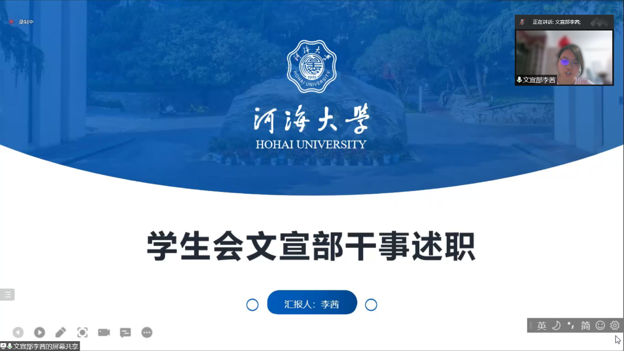 外联部杨磊同学介绍了部门举办的“新干事见面会”、“新生辩论表演赛”等活动,外联部以积极向上的工作态度,做好了各部门之间的联系桥梁,为同学们打造了各种精彩纷呈的活动。