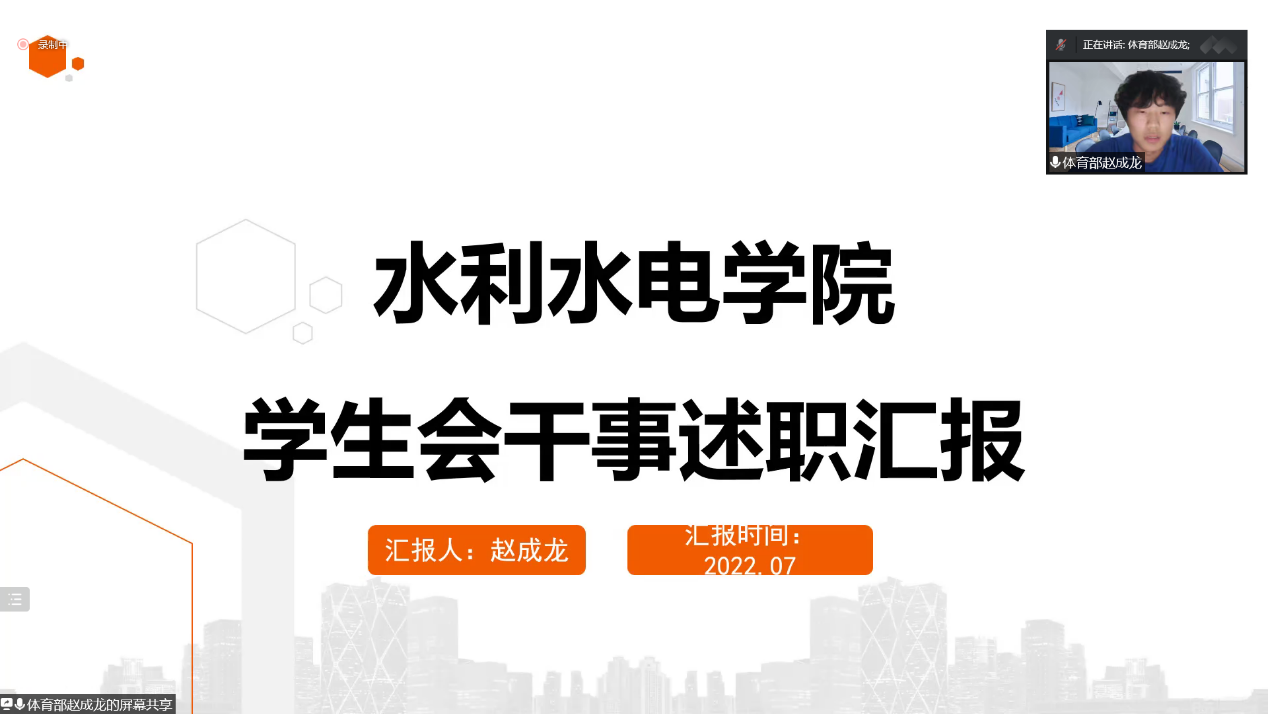 权益部张煜浩同学介绍了本学年部门举办的门牌秀、权益风暴、“三·七女生节”等活动,充分展现出了权益部的担当与风采,他们润物细无声地为水电学子提供各种必要服务,并积极为其做好权益保障。
