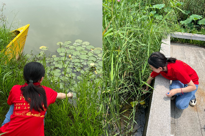实践团在保证实践安全的情况下,按照《地表水环境质量标准》(GB3838-2002)用采水器在每个采样点距离湖面0.1m水层采集水样,用于pH值、溶解氧、氨氮、高锰酸盐指数、总磷等指标测定。团队成员做好记录工作,将水样带回进行水质检测,并撰写水质检测报告。