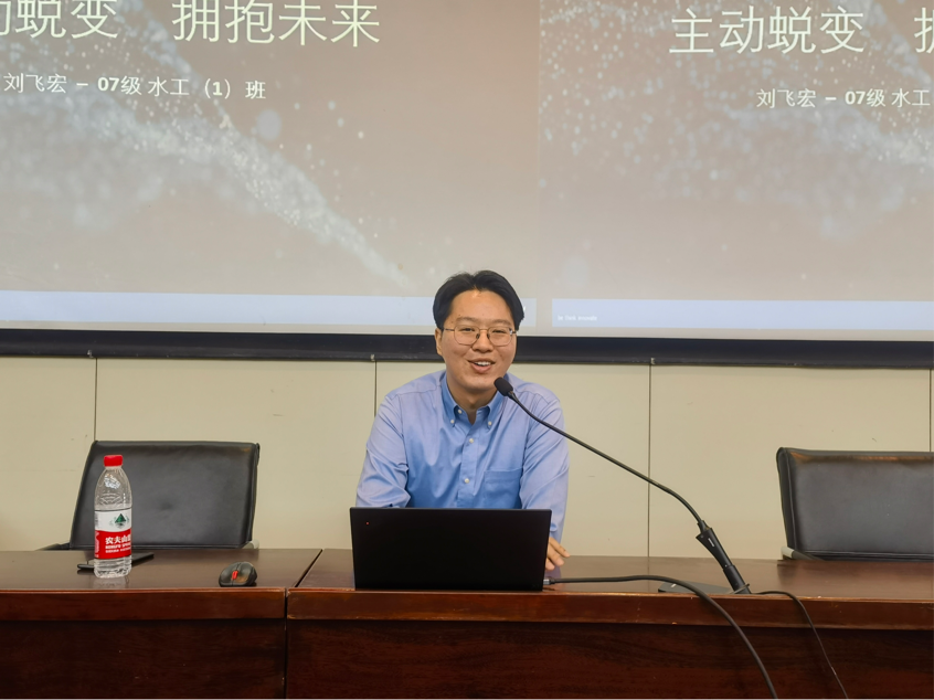 徐海峰学长指出,老员工活需要做到三个关键词:一是要“主动融入”,围绕求学、历练、交友三个维度来介绍如何融入大学,全方位开启专属的老员工涯。二是要“找准定位”,确立目标,理清思路,利用逆向思维作好长期和短期职业生涯规划,引导自身学习和实践活动。三是要“迎接未来”,以自身工作视域为同学们展望了水工和智慧水利专业的未来发展方向,基于水利专业谈转型和融合发展。他表示,大家既要顺应专业转型的大趋势,也强调了立足于本专业的重要性,让大家做“水利+”的专业复合型人才。