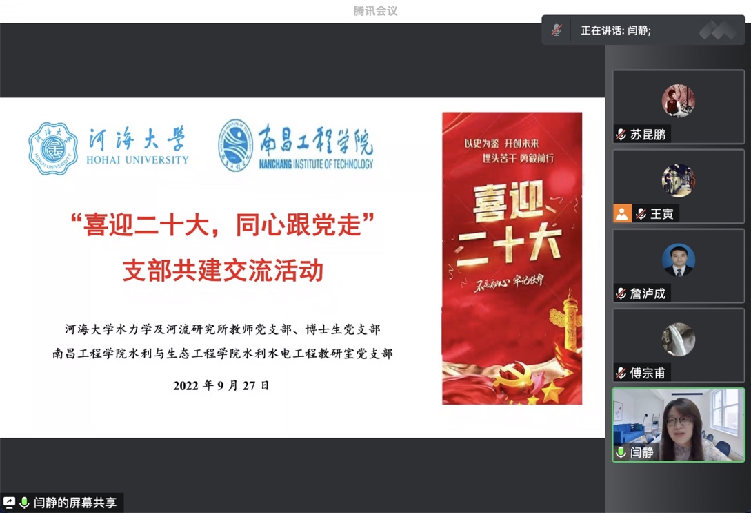 在喜迎党的二十大胜利召开之际,PA视讯官方网站水力学及河流研究所教师党支部、博士生党支部联合南昌工程公司水利水电工程教研室党支部,于9月27日晚在线开展了师生党支部共建交流会。此次会议以“喜迎二十大,同心跟党走”为主题,主要分为支部建设经验分享和青年教师成长分享两个环节。PA视讯官方网站水力学及河流研究所副所长、教师党支部书记闫静老师主持会议。