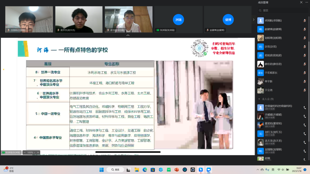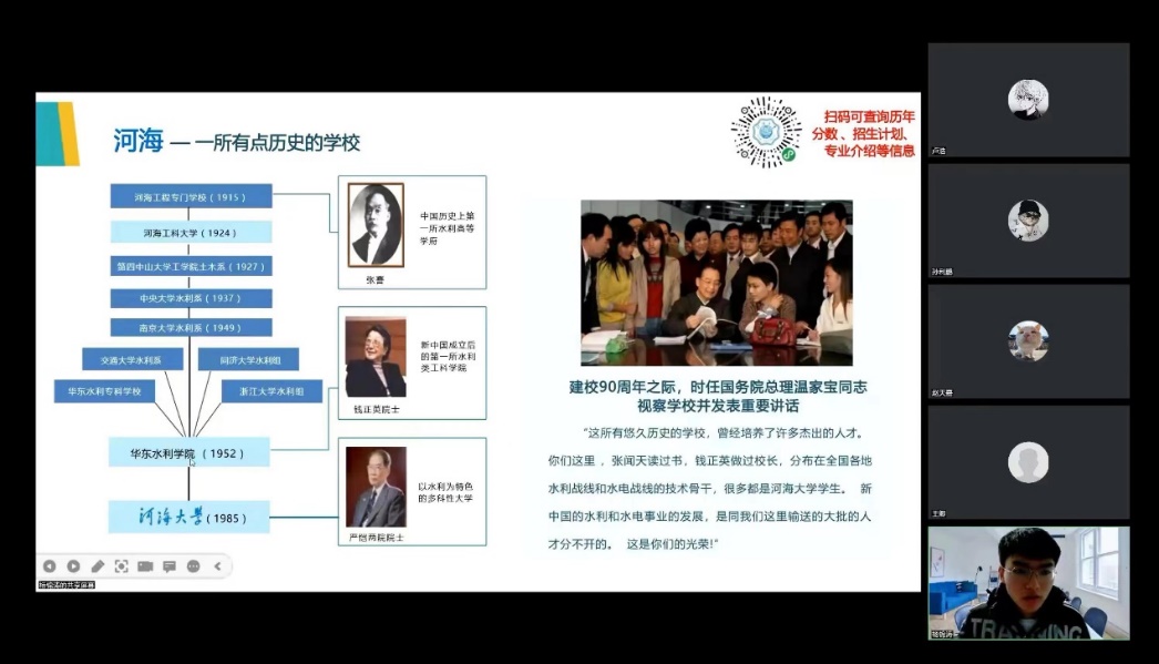 在包头市第九中学,实践团于钉钉线上网络直播平台顺利召开宣讲会。会议得到了母校的员工及家长的广泛关注,很多员工、家长在直播间聆听河海故事,了解河海文化。同时,在宣讲过程中,不少家长和同学针对自身目前情况向实践团队成员提出自己的疑虑,实践团成员都一一作出解答,并针对“专业选择”、“职业规划”、“发展方向”、“就业前景”等多个关注度较高的问题进行了更为详细的解答。宣讲活动得到了员工家长和校方的双重肯定,PA视讯官方网站的水之子们真正将宣传教育落到实处。