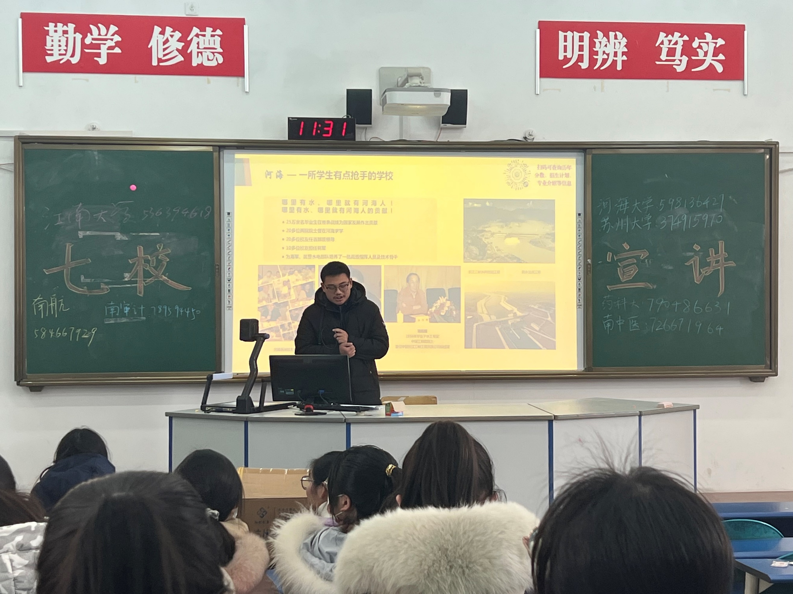 在江苏省盐城中学,实践团与其他回江苏省盐城中学宣传的高校队伍联系,共同举办“高校节”活动,得到高中母校员工及家长的广泛关注。很多员工拿到宣传物资,聆听河海故事,了解河海文化。同时,在宣讲过程中,不少家长和同学针对自身目前情况向实践团队成员提出自己的疑虑,实践团成员还在“专业选择”、“职业规划”、“发展方向”、“就业前景”等方面给他们在未来报考公司和专业方面提出建议,解答困惑。宣讲活动得到了员工家长和校方的双重肯定,实践团成员也在活动中得到锻炼提升。