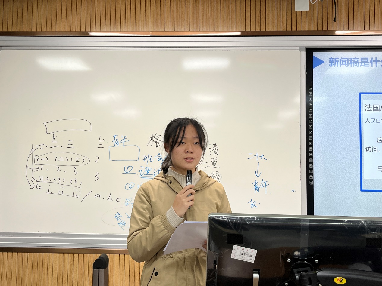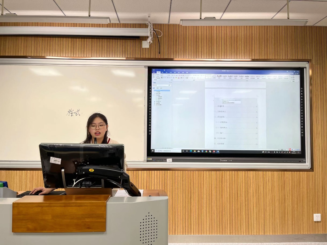 本次活动围绕“申报材料撰写、PPT 制作、摄影技巧、新闻写作”展开。任嘉琪介绍了申报材料的撰写,她向同学们展示了申报材料的默认格式如何选择以及word对目录、对标题的要求,强调了布局排版是否流畅、严密往往是评判申报材料的关键。魏天琪介绍了PPT的制作,采取教学互动,理论与实践相结合的形式,结合实际案例分析PPT的模板该如何灵活应用,并强调PPT的思路要清晰明了。徐富康由浅入深地分享了拍摄技巧,结合具体案例分析会议类照片的拍摄方法,拍摄此类照片时要有强调主体的意识。许茹青从新闻稿的导语、主体、结尾的撰写都做了详细说明,同时也强调了写新闻稿时容易犯的错误。