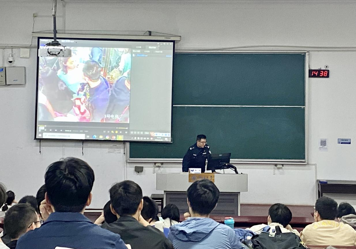 孙警官首先从教学秩序、生活秩序、学习研究等多个方面强调了校园安全的重要性,尤其提醒同学们文明上网,在网上发表不当言论会带来诸多不良后果,甚至会影响到毕业就业。其次介绍了校园内常见的八类电话诈骗话术,具体包括:刷单赚钱、裸聊约炮、冒充公检法并称通过网络聊天工具发布财产冻结、冒充客服谎称京东借条等、在QQ微信等平台冒充熟人借款、网络虚拟货品交易骗取手续费、提供网络无抵押贷款时需预付保证金、网络交友诱导当事人进行网络博彩等。此外,孙警官还讲解了近年来校园内真实发生的诈骗案例,为同学们详细还原了诈骗的过程和套路,同时结合展示被骗交易截图、防诈宣传视频等宣传材料,引起同学们的强烈共鸣。