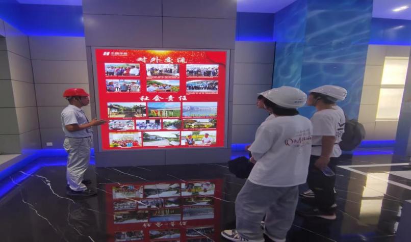 进入景洪水电站内部,员工蒋金磊向团队成员们介绍了中国华能集团有限公司、华能澜沧江水电股份有限公司及其企业文化核心理念,对近年来公司“五个一”社会责任理念(建设一座电站,带动一方经济,保护一片环境,造福一方百姓,共建一方和谐)的践行情况进行详细的说明。