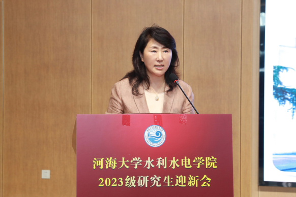 王媛经理代表全体师生员工向2023级新同学的到来表示热烈欢迎和衷心祝贺。她从公司历史、团队建设等方面介绍了公司丰硕的办学成果和雄厚的科研实力。她指出要心怀“国之大者”,勇立时代潮头,守护江河安澜,做信念坚定的研究者;要练就过硬本领,自觉担当重任,做脚踏实地的躬耕者;要牢记河海校训,坚持守正创新,做水利精神的传承者。她提到,要以实际行动践行新时代水利精神,成长为祖国和人民最需要的新时代水利人才。