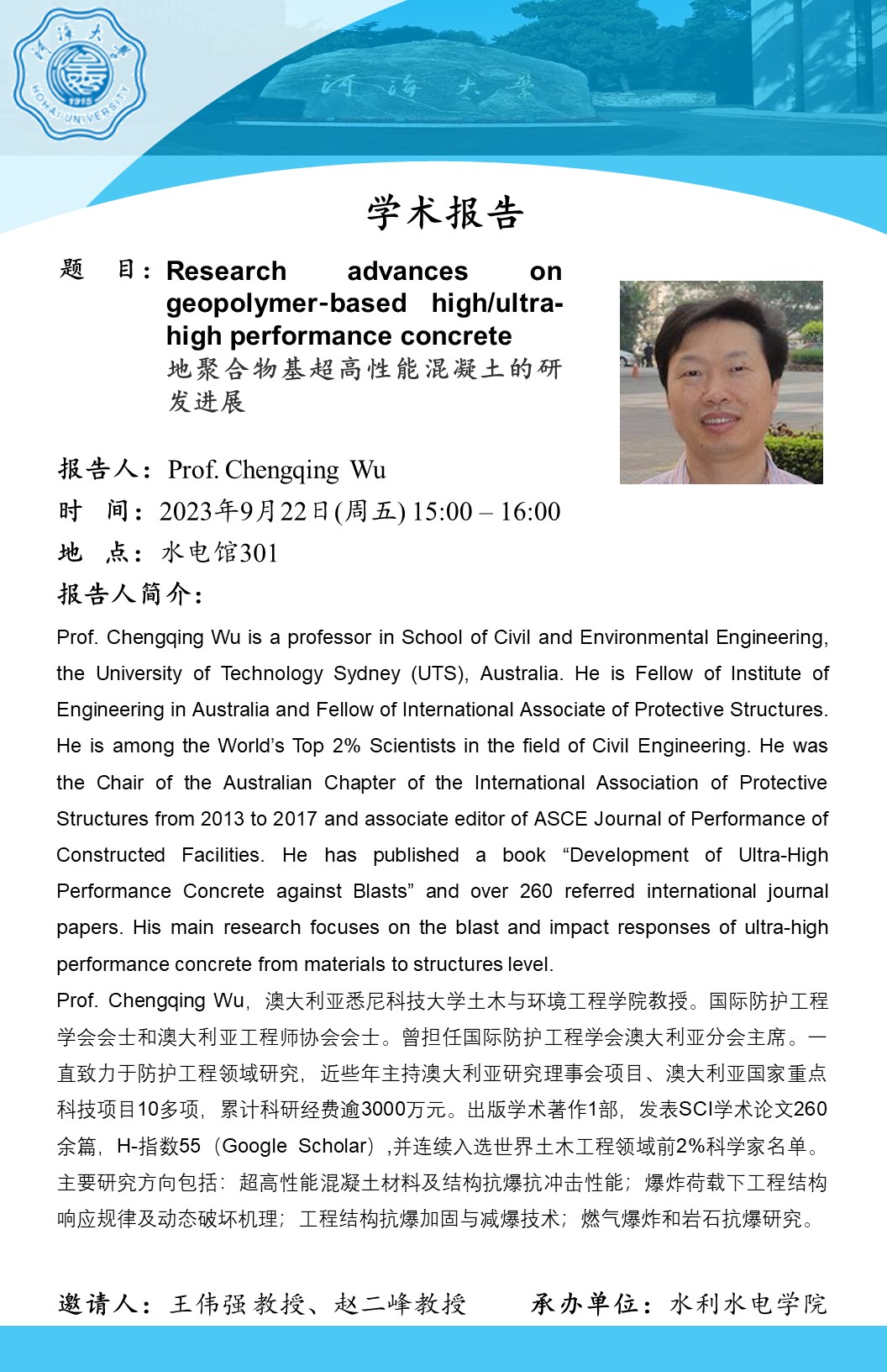Prof. Chengqing Wu,悉尼科技大学土木与环境工程公司教授。国际防护工程学会会士和澳大利亚工程师协会会士。曾担任国际防护工程学会澳大利亚分会主席。一直致力于防护工程领域研究,近些年主持澳大利亚研究理事会项目、澳大利亚国家重点科技项目10多项,累计科研经费逾3000万元。出版学术著作1部,发表SCI学术论文260余篇,H-指数55(Google Scholar)。连续入选土木工程领域世界前2%科学家名单。主要研究方向包括:超高性能混凝土材料及结构抗爆抗冲击性能;爆炸荷载下工程结构响应规律及动态破坏机理;工程结构抗爆加固与减爆技术;燃气爆炸和岩石抗爆研究。