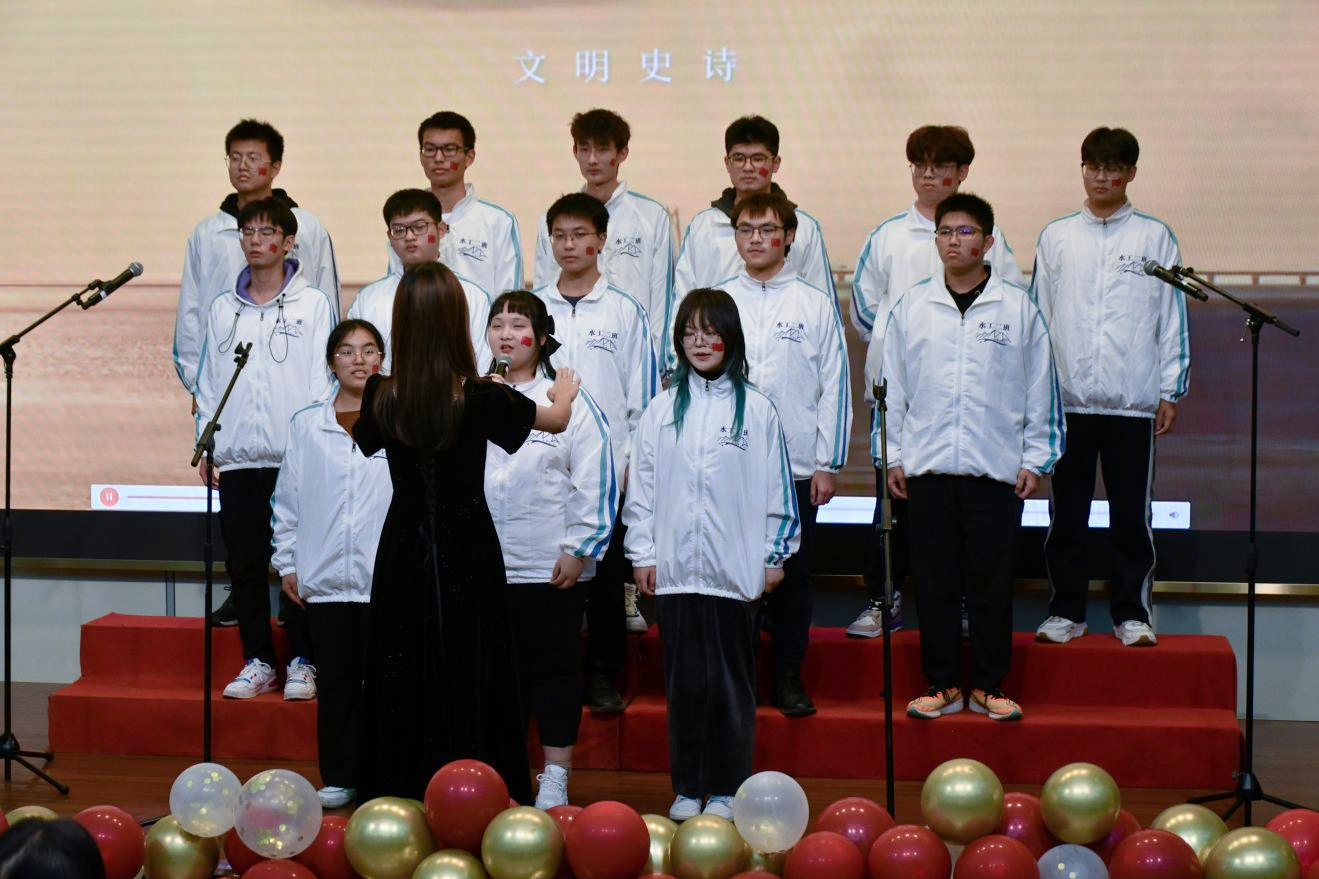 比赛舞台上,2023级本科生共10个班级同学演唱了《国家》、《不忘初心》、《我爱你,中国》、《少年中国说》等脍炙人口的经典爱国歌曲,嘹亮的歌声展现了全体员工热爱祖国、团结奋进的精神风貌,用歌声颂扬祖国的丰功伟绩,用音乐奏响青春的乐章。