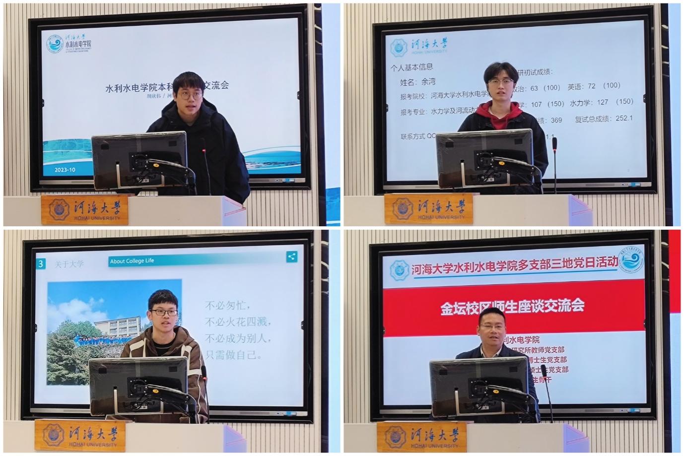 为推动学习贯彻习近平新时代中国特色社会主义思想主题教育走深走实,扎实推进“我为师生办实事”系列活动,11月11日下午,公司水力学及河流研究所教师党支部赴金坛校区开展多支部联合党日活动,与水力学及河流动力学博士生党支部金坛校区成员、2023级硕士生党支部、22级本科生代表座谈交流。师生座谈交流会由教师党支部书记闫静主持,分为竞赛颁奖、学科和创训介绍、保研考研经验分享、师生互动4个环节。