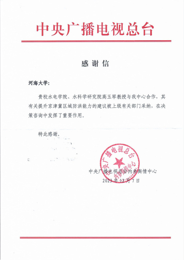 公司长三角洪涝旱灾害防御研究室主任高玉琴教授接受了中央广播电视总台内参舆情中心的采访,谈论了蓄滞洪区建设平原型水库的注意点及提升京津冀地区防洪能力的建议,被上级有关部门采纳,为决策咨询提供了重要的技术支撑。