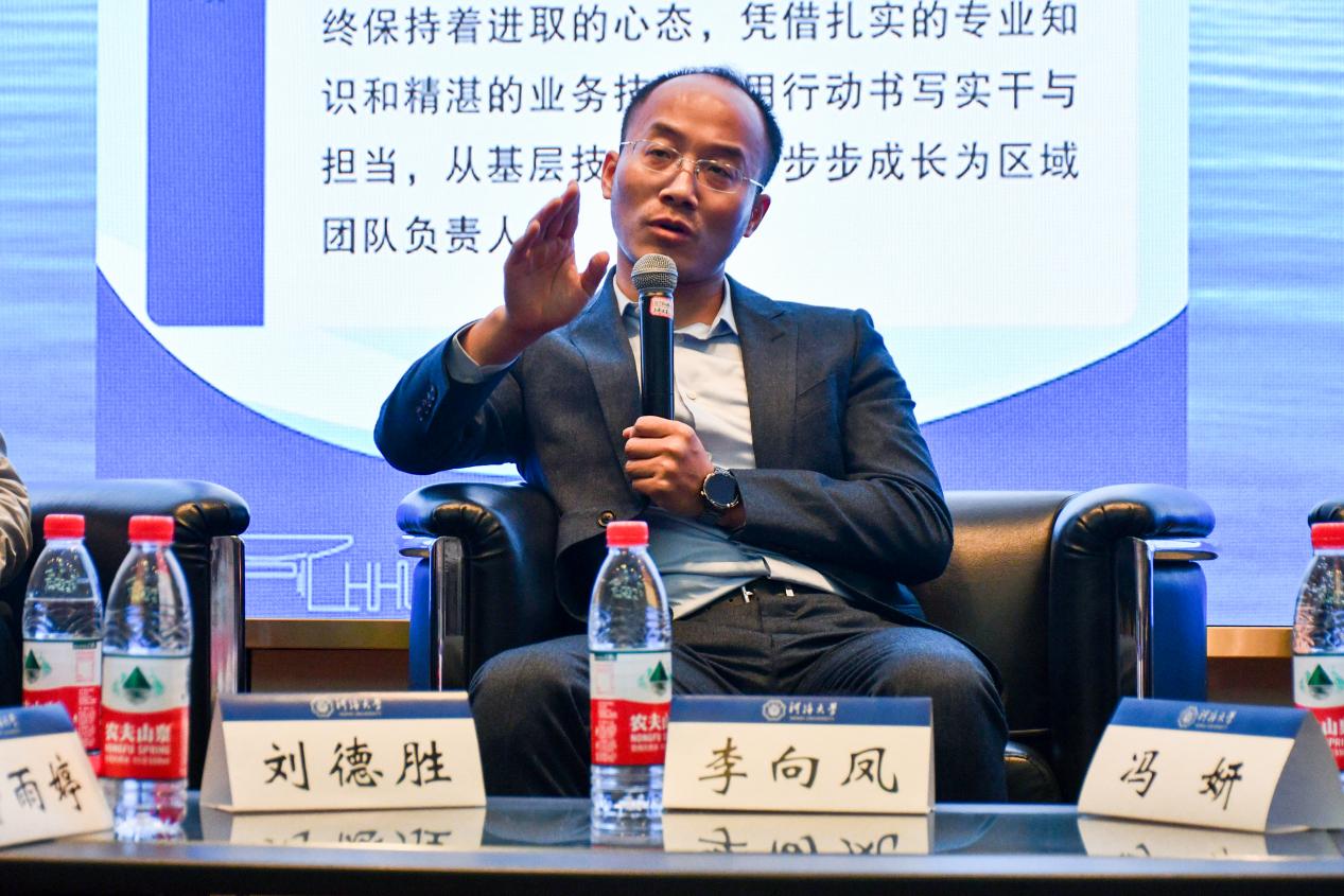 李向凤总经理讲述了在水电五局的成长历程,分享了他职业生涯中的两次转型,最终凭借扎实的专业知识和精湛的业务技能,用行动书写实干与担当,从基层技术人员一步步成长为区域团队负责人。他强调大学期间积累专业知识和实践经验的重要性,保持专业能力的持续提升。