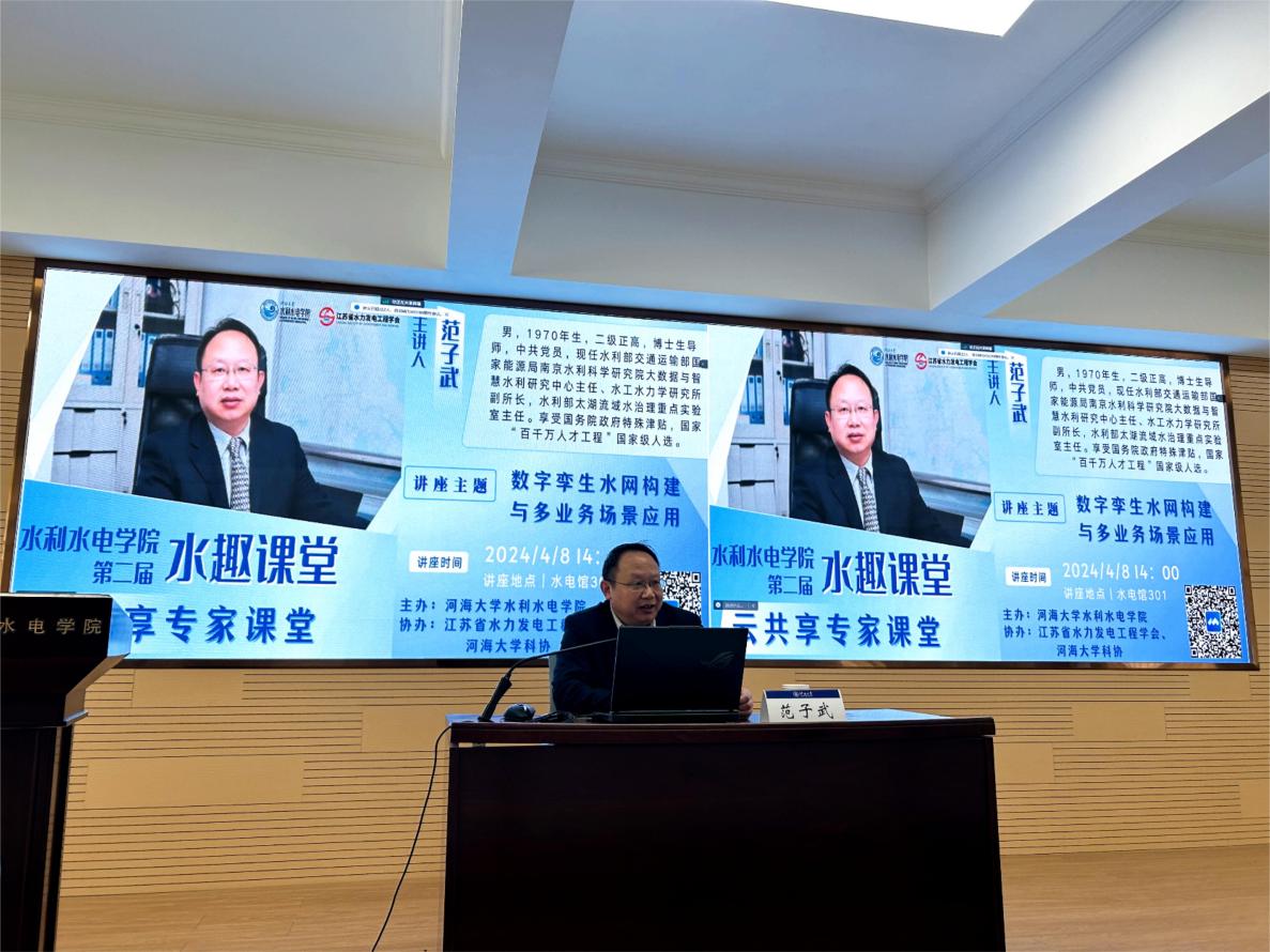 范子武教授围绕“数字孪生水网构建与多业务场景应用”作专题讲座,向同学们介绍了数字孪生水网在新形势下的建设发展背景、建设理念以及发展趋势;并以太湖地区为例,详细介绍了数字孪生水网的建设标准和实施过程,深入剖析了数字孪生技术在太湖流域水治理中的实际应用和取得的显著成效。他强调,数字孪生水网的建设不仅有助于提升水治理的效率和精度,还能为区域经济的可持续发展提供有力支撑。此外,范教授还就“四预”业务体系构建进行了深入讲解,并且列举“数字孪生滆湖”、“数字孪生金鸡湖”两个案例,详细介绍了“2+N”业务试点实践活动的初步成功与预期目标。他指出,通过构建完善的业务体系和新平台,可以进一步推动数字孪生水网在水利业务中的广泛应用和深度融合。