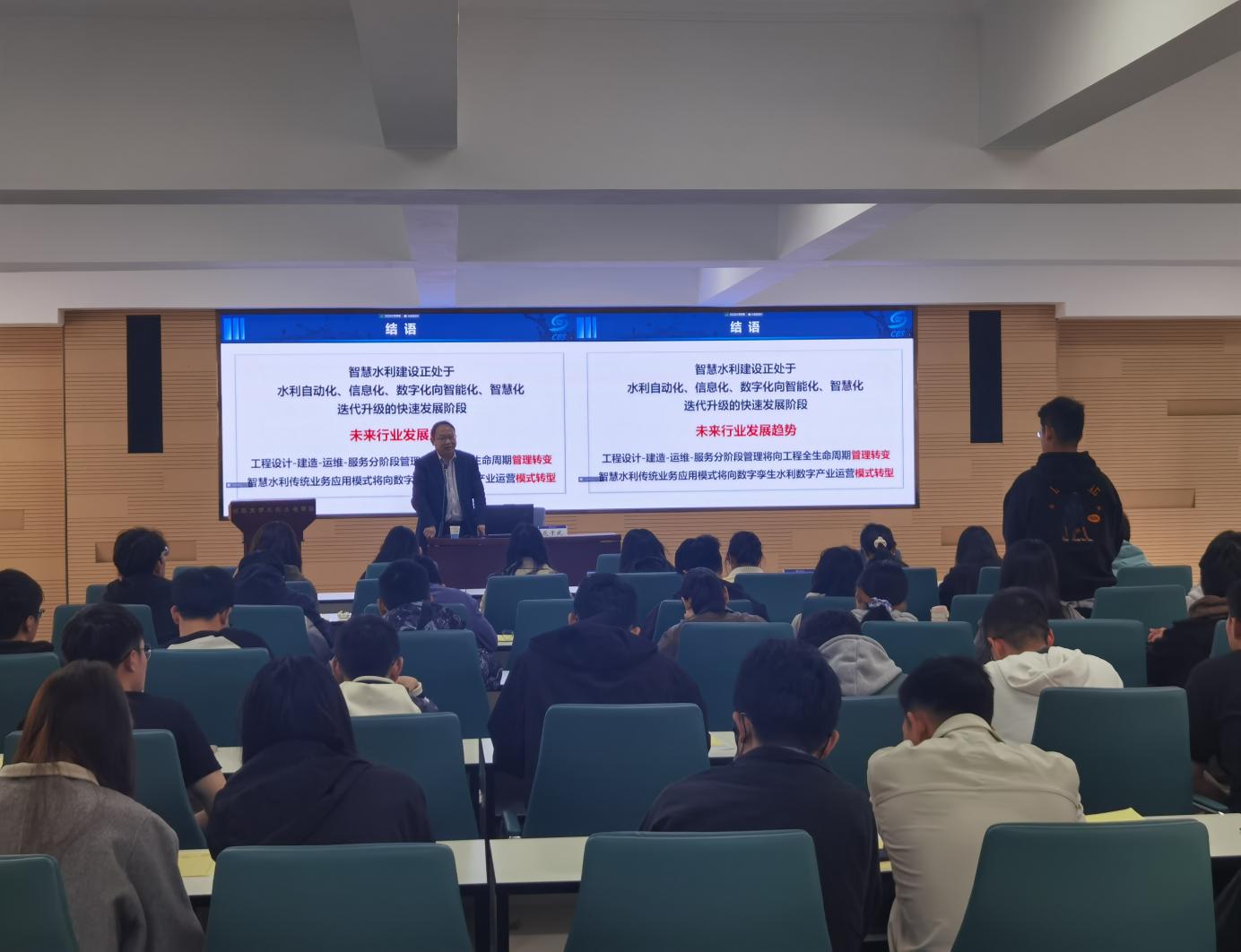 问答互动环节,范教授对同学们感兴趣的问题耐心给予解答,让大家对数字孪生水网构建有了更加深刻的认识和体会。范教授强调智慧水利建设正处于水利自动化、信息化、数字化向智能化、智慧化迭代升级的快速发展阶段,希望同学们能够紧跟时代步伐,继续深入学习数字孪生水网技术,也期待大家能够积极参与科研与实践,不断探索和创新,为水利事业的持续发展贡献力量。