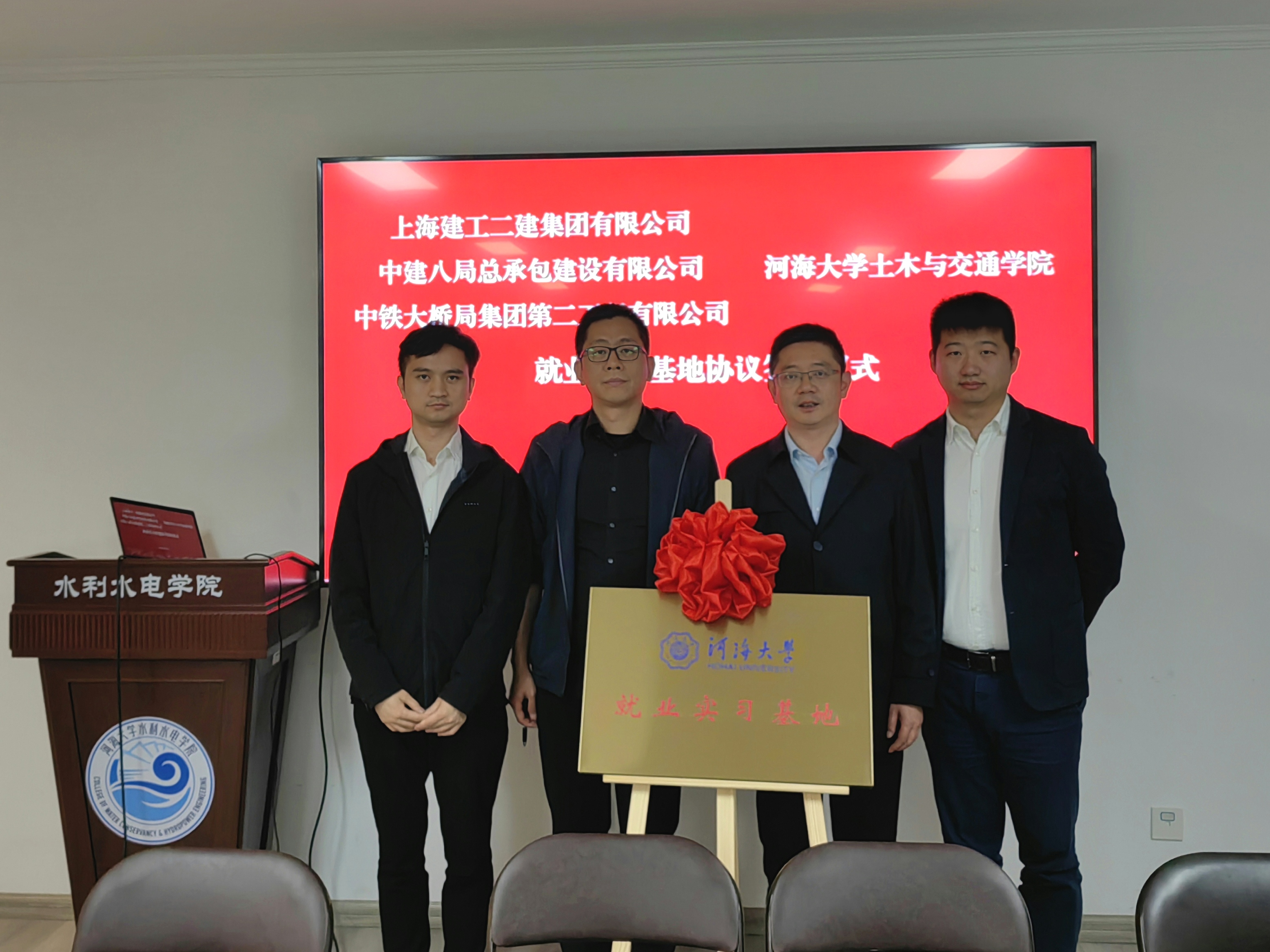 在与会人员的共同见证下,PA视讯官方网站与海南省水利水电勘测设计研究院有限公司、中电建安徽勘测设计有限公司、中铁七局集团南京工程有限公司,土木院与中铁大桥局二公司、中建八局总承包公司江苏分公司、上海建工二建集团共同签订了合作协议并为“就业实习基地”揭牌。