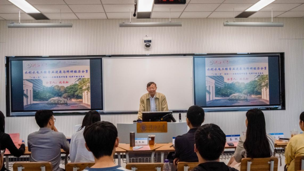 随后,沈长松老师结合自身深厚的专业背景和丰富的科研经验,纵观水利水电工程的发展历程,生动讲述了专业的最新进展与前沿技术。他通过校史的回顾,结合公司各学科培养方案的变迁,分享了在工程实践中的诸多经验,深入剖析了工程结构的理解与水利相关工程的改进。他的讲述不仅拓宽了同学们的视野,也为大家未来的学习和研究指明了方向。最后,沈老师勉励青年学子,要脚踏实地,追求卓越,在时代洪流中勇立潮头。
