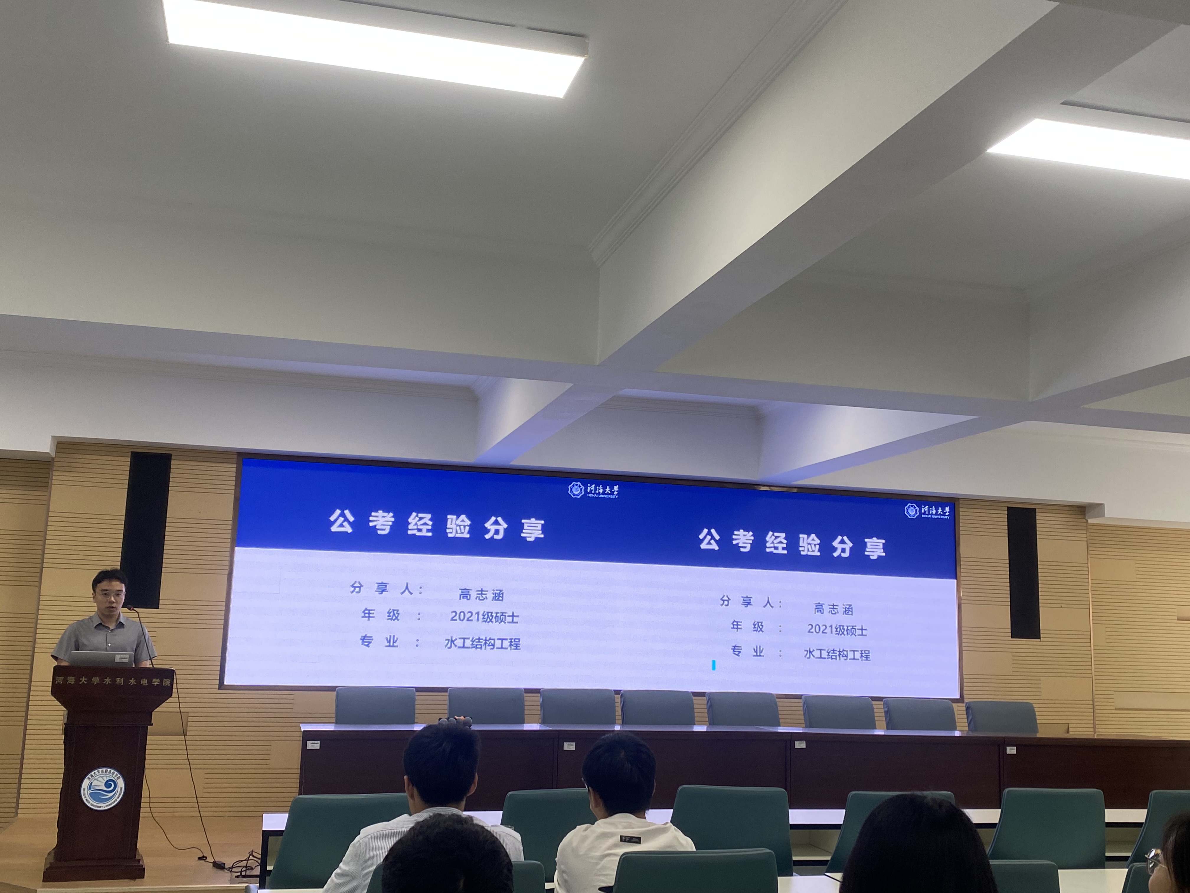 高志涵同学以“公考经验分享”为主题,向学弟学妹们介绍了国家公务员考情、岗位选择要点、各环节备考经验以及时间安排。系统地讲解了公司水利工程一级学科可以报考的优势岗位、公考笔试面试的复习技巧,并详细分析了研三一年毕业论文与公考复习的时间安排。高志涵同学建议有意考公的师弟师妹不因考公影响毕业论文相关工作,秋招和公考两手抓,合理规划时间,全身心投入学业与求职,并祝愿大家能够旗开得胜,一战成公。