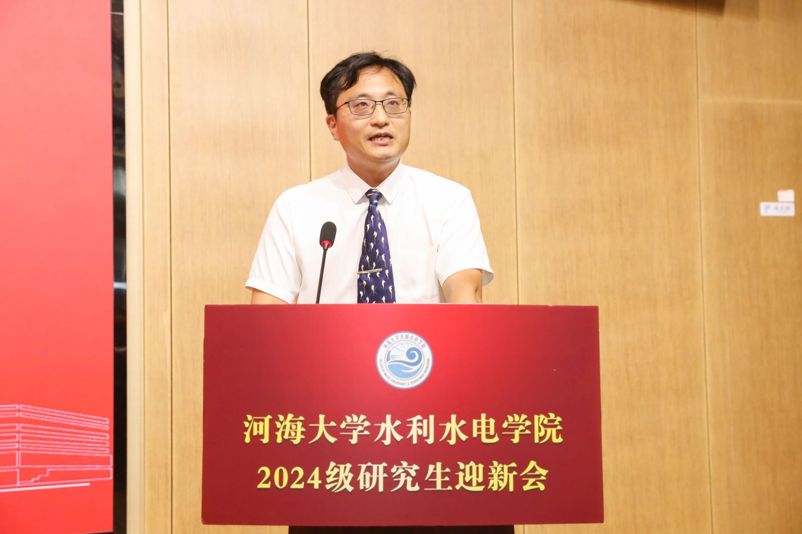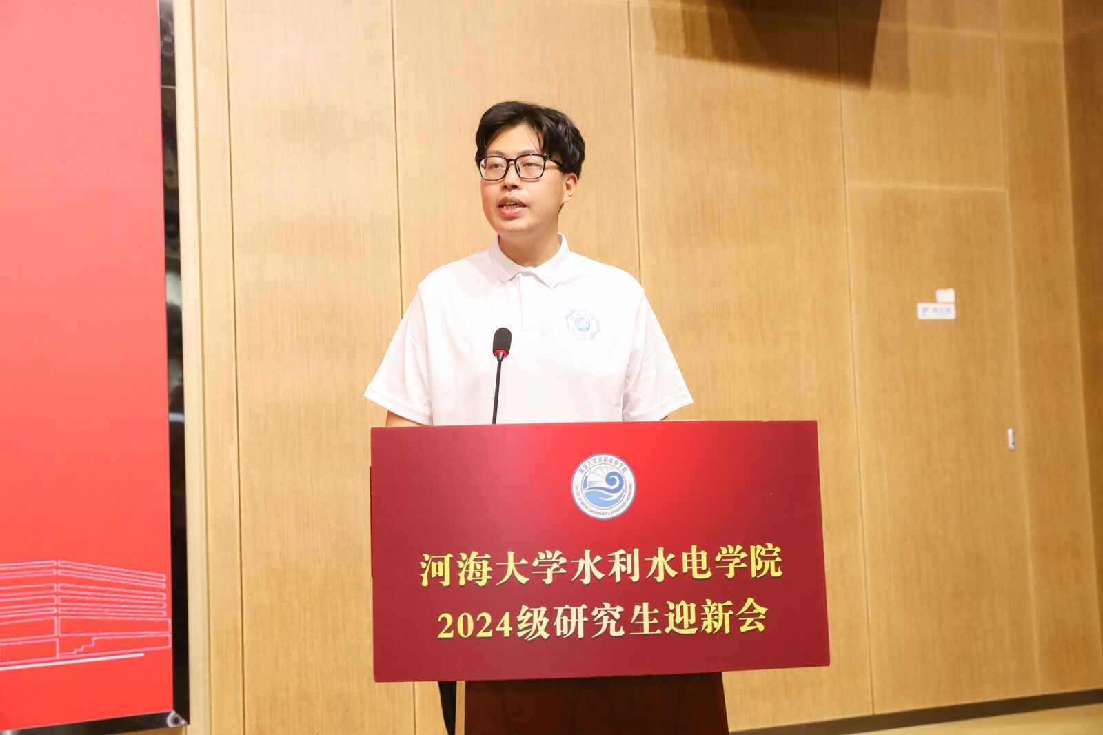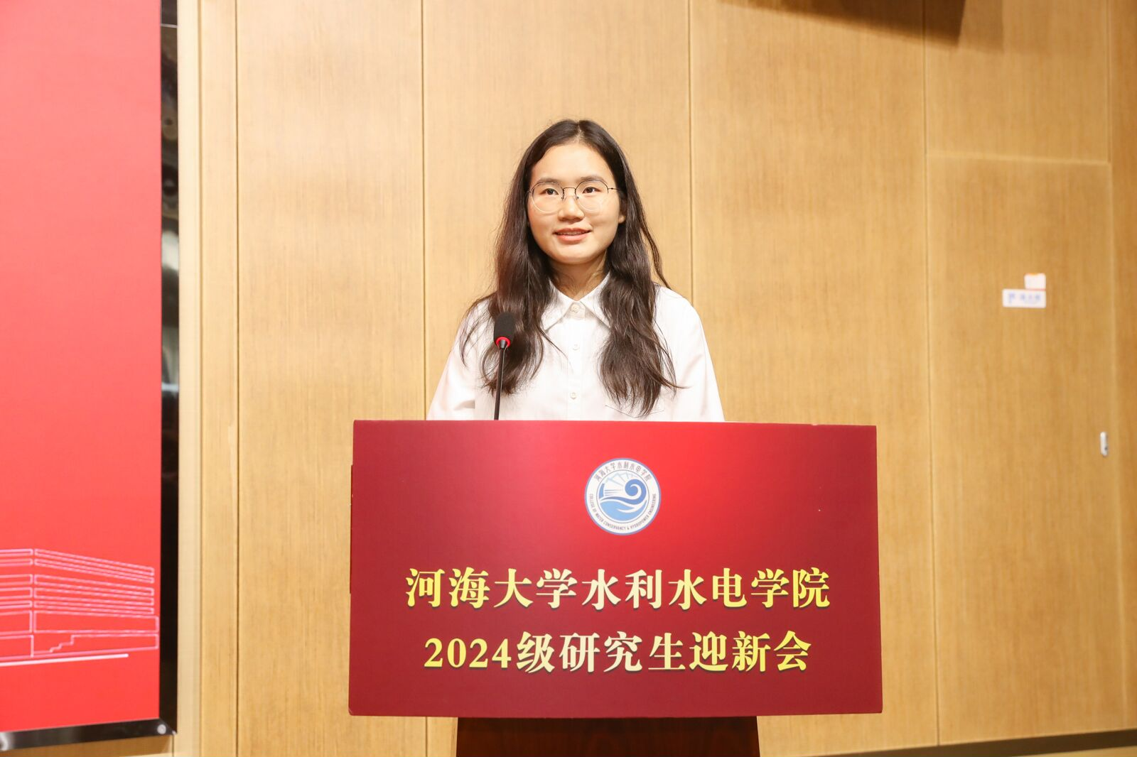 新生代表2024级硕士研究生李子涵发言。她表示作为水之子,当有滴水穿石的决心、积流成川的恒心、缘流趋下的虚心、浪遏飞舟的雄心和水乳交融的齐心,要接过千千万万水利先辈们的历史接力棒,在祖国的大好山河追梦、筑梦、圆梦,毋负邦人期。
