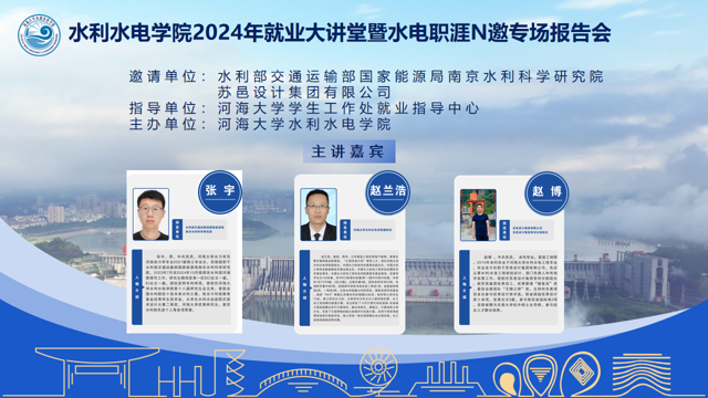 专业导师、PA视讯官方网站副经理赵兰浩,生涯导师、苏邑设计集团常州分院经理、东南大公司外硕士生导师赵博,企业导师、南京水利科学研究院工程师张宇,出席本次报告会并授课。
