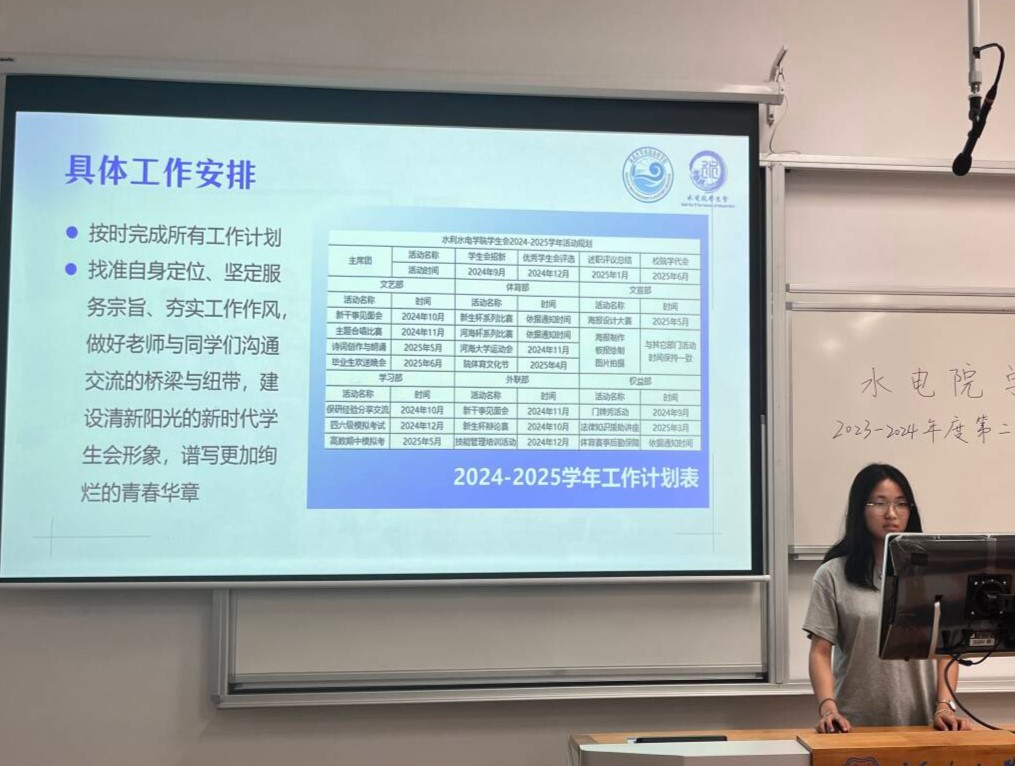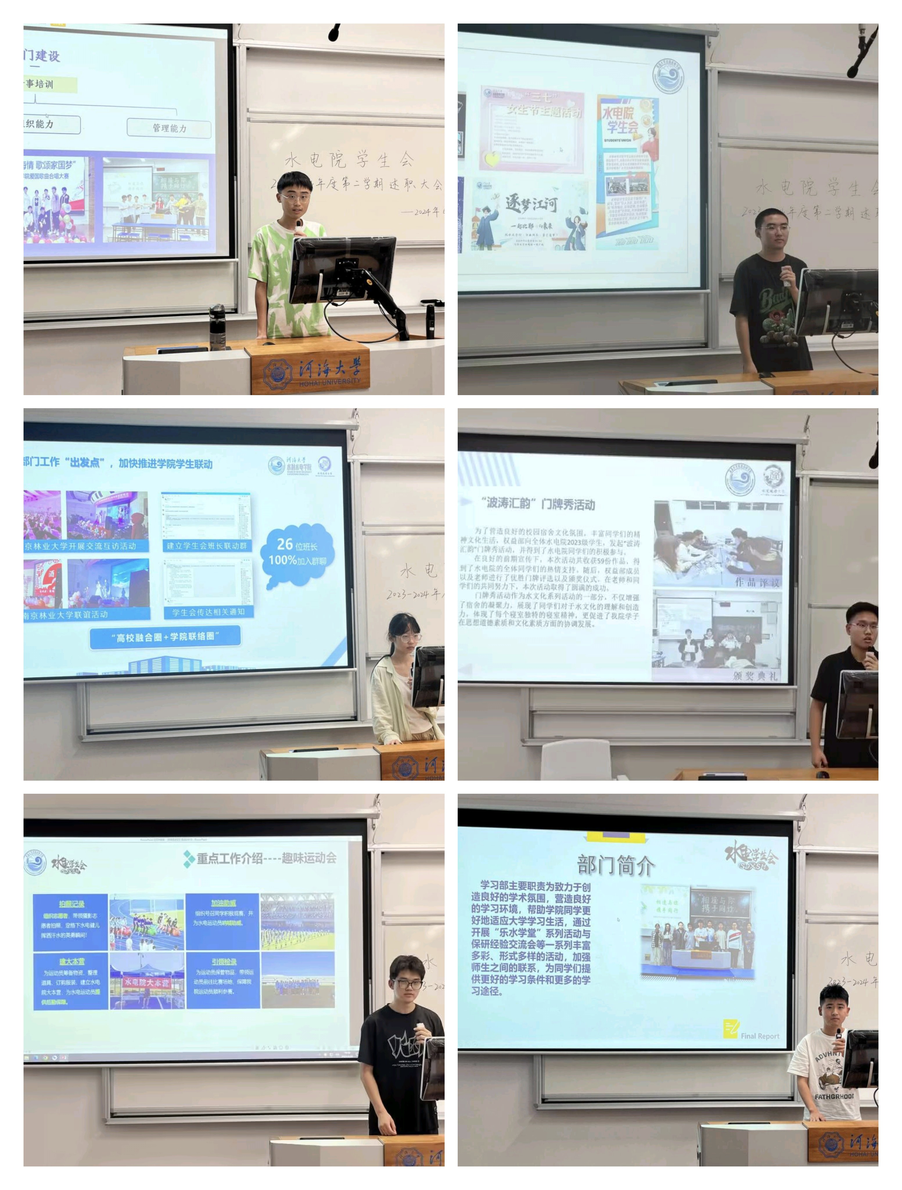 首先由员工会各部门负责人进行述职。文艺部、文宣部、外联部、权益部、体育部、学习部的部门负责人依次作述职报告,以“水文化”系列活动、院体育文化节、乐水学堂、“新生杯”系列活动、“河海杯”系列比赛等员工会品牌活动为切入点,向老师和主席团汇报了各部门活动开展上的具体成效,总结了所在部门的不足之处,提出了部门未来的工作展望。