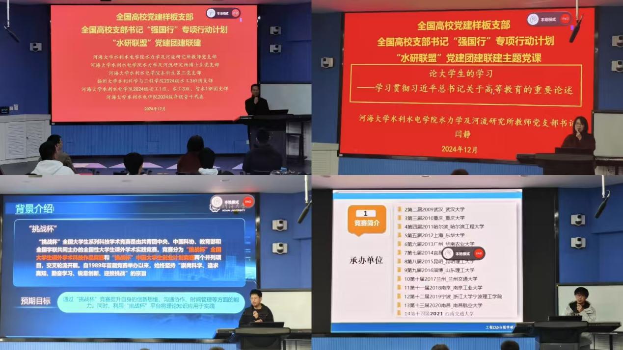 水力学及河流研究所教师党支部青年教师代表徐津、博士生党支部党员代表刘进,分别分享“挑战杯”全国老员工课外学术科技作品竞赛、“高教杯”全国老员工先进成图技术与产品信息建模创新大赛的参赛经验与指导体会,加强员工科创思维,提升创新能力。