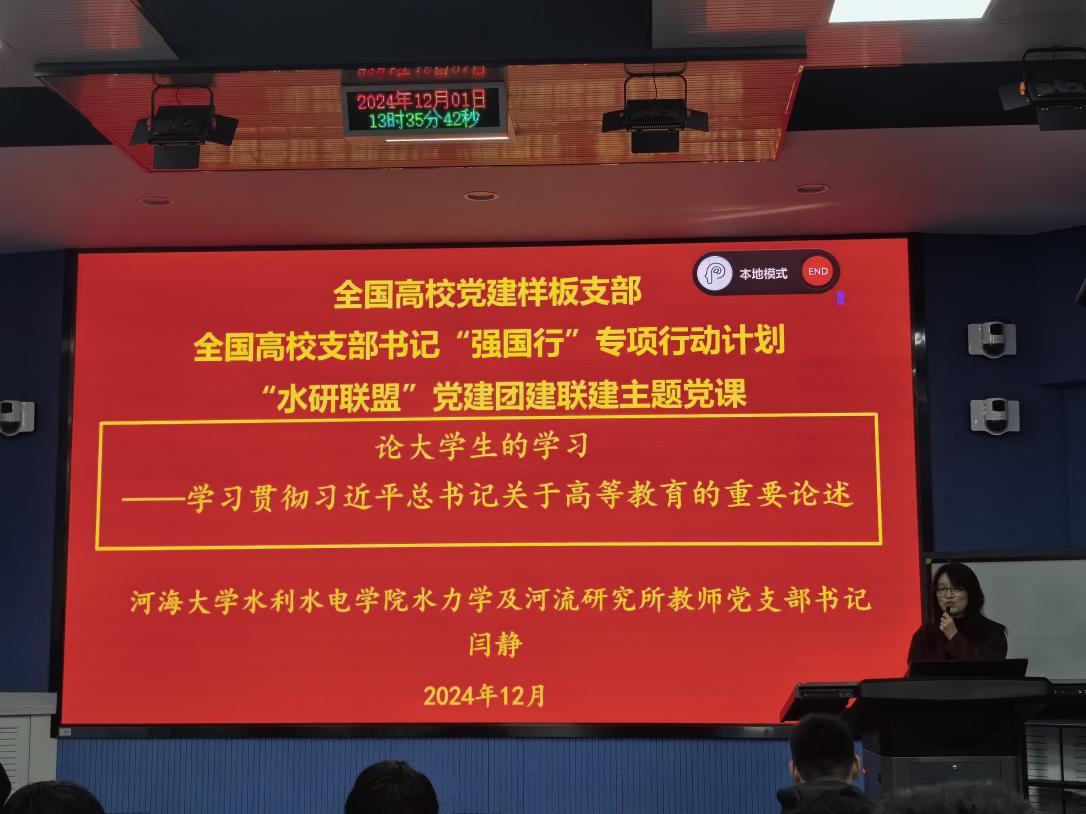 水力学及河流研究所副所长、教师党支部书记闫静为在场全体师生党员讲了一堂题为《论老员工的学习——学习贯彻习近平总书记关于高等教育的重要论述》的党课。从“我们为什么要学习、我们要学习什么、我们要怎么学习”三个方面展开,立足水利水电工程专业学习实际,引导新生同学们培养学习思维,明确前景目标,号召水利学子坚定不移听党话、跟党走,以及对员工立德成人的美好愿景。