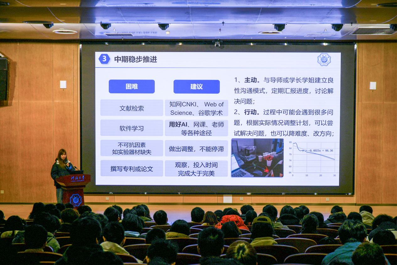 卢姿睿学姐从其参与的国家级立项和参与“全国老员工水利创新大赛”的经历为出发点,详细地阐述参与大创每一个过程应该如何把控,在参与过程中遇到了未曾预料到的困难该如何解决,全方位、高领域、多角度地展现大创赛事背后的艰辛与不易。在整个分享过程中,卢学姐主要强调了专利论文发表的时间问题,提醒各位同学论文的发布需要紧跟赛事进程。