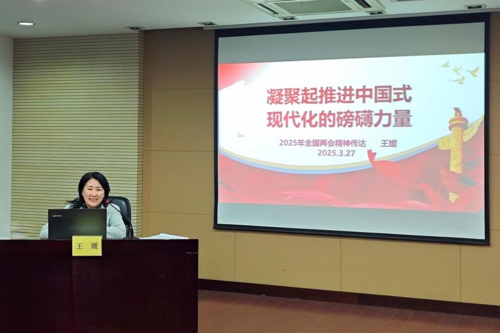 王媛经理以“凝聚起推进中国式现代化的磅礴力量”为主题,结合自身3月4日—10日前往北京人民大会堂参加全国两会的经历,向在场师生详细解读了2025年全国两会的基本情况、主要特点、核心内容与重点议题,分享自己的履职体会。她谈到,今年全国两会重点聚焦高质量发展、科技创新、生态文明建设等方面,深刻把握中国式现代化对教育、科技、人才的需求,其中江苏作为经济大省,要勇挑大梁,在发展新质生产力、科技创新与产业创新融合、深化改革开放、促进共同富裕等方面发挥示范带头作用。