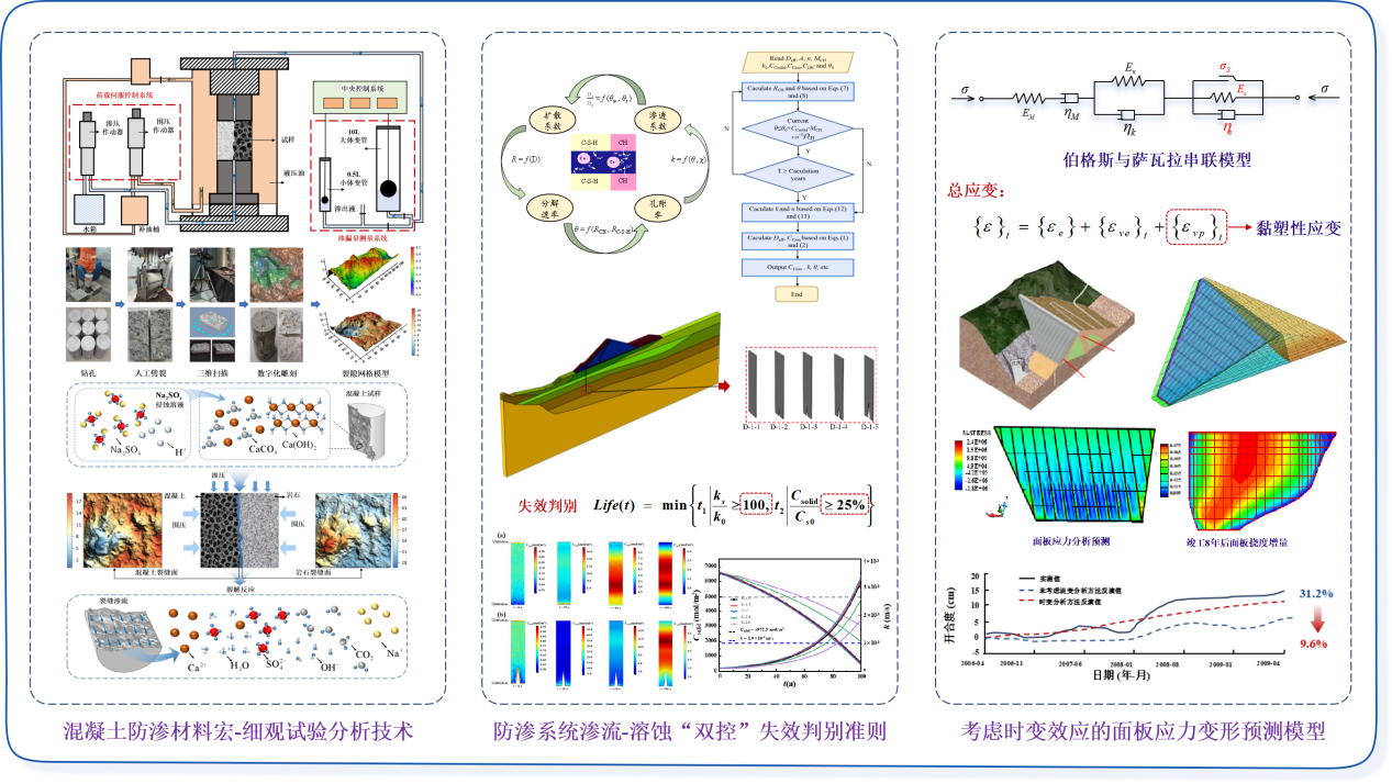 针对混凝土面板、防渗墙及灌浆帷幕等混凝土防渗体在长期服役过程中性能劣化显著、测试手段缺乏的问题,研制了首个二级配大尺寸混凝土渗透溶蚀试验装置,破解了超高水力梯度下开裂混凝土面板渗流量、钙离子浓度和裂缝开度等参数的联合测定难题,探明了混凝土面板宏观渗透行为与微观胶凝物质溶解之间的内在联系,填补了混凝土面板渗流-溶蚀耦合分析领域的空白;针对防渗系统时变性态分析方法与寿命评估准则缺失的问题,提出了考虑防渗材料本体与支撑结构变形影响的时变分析技术和混凝土面板防渗与强度“双控”寿命评估准则,实现了混凝土面板坝时变性态和服役寿命精准预测;针对深厚覆盖层上高面板堆石坝长效性能评估误差大的问题,开发了考虑覆盖层和面板坝流变效应的弹-黏弹-黏塑硬化模型,确定了坝体变形、接缝变形和面板应力动态安全评价指标及阈值,实现了深厚覆盖层面板坝长效性能评估及预测。