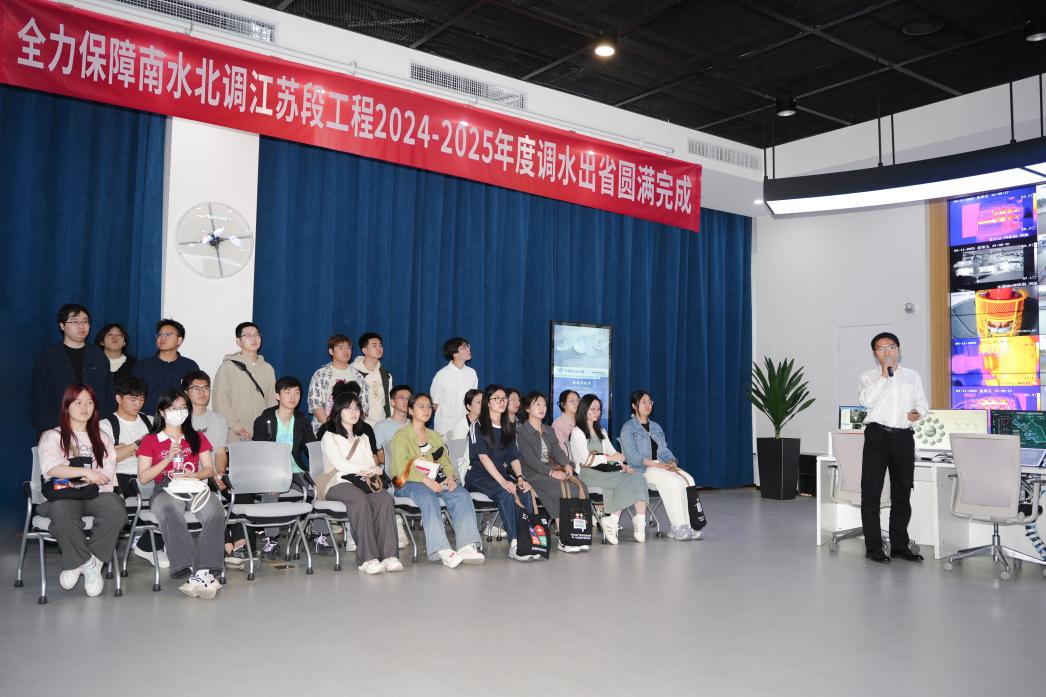 师生们前往南水北调东线江苏水源有限责任公司,参观江苏水情教育基地。基地内,通过《东源流长 润泽四方》宣传片及沙盘模型,师生们直观了解了南水北调东线工程的宏伟规划与建设成就。该工程自2005年启动以来,历经多年攻坚克难,已形成“T”字型供水大动脉,串联洪泽湖、骆马湖等四大调蓄湖泊,实现“水往高处流”的工程奇迹。南水北调东线江苏水源有限责任公司的工作人员以“南水北调工程现状及发展趋势”为题,详细介绍了工程规划、建设历程及未来展望,并通过现场互动解答了员工们关于工程效益、技术突破等方面的疑问。