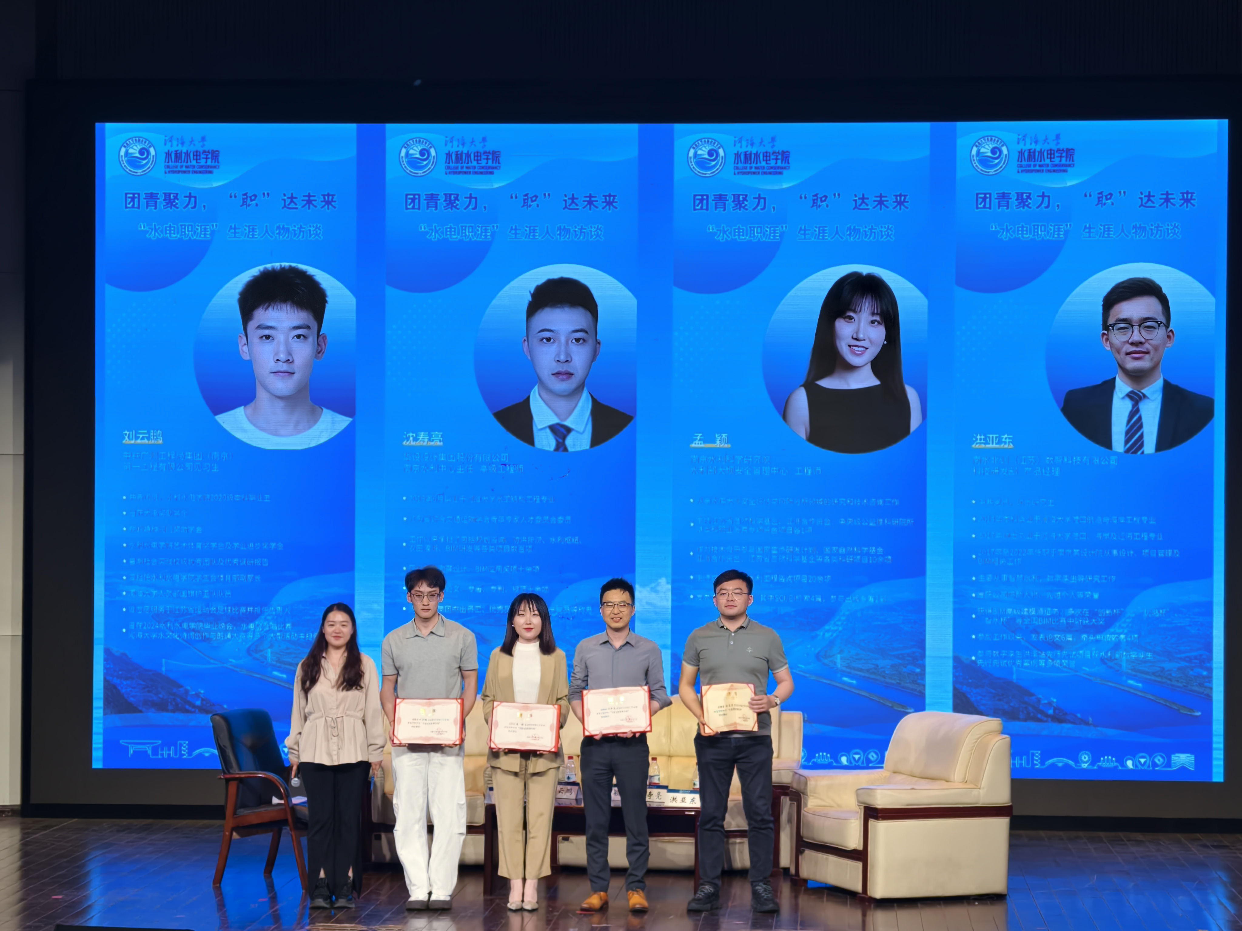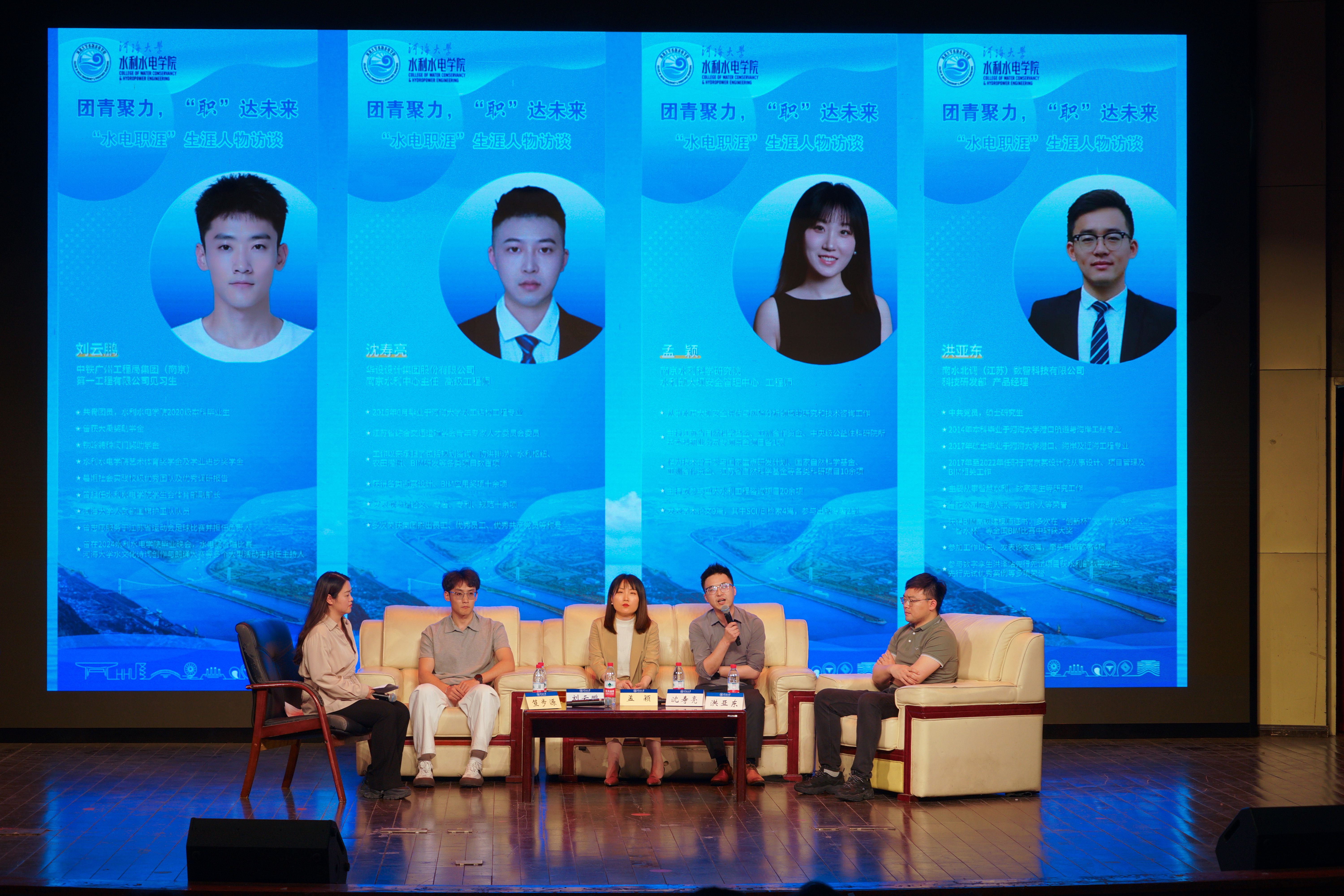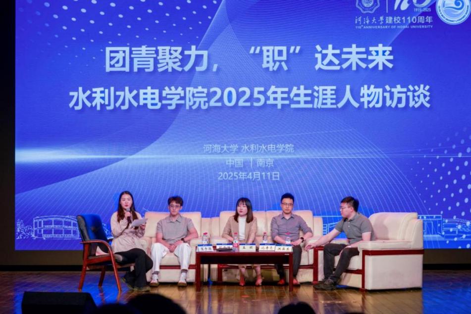 为助力员工明晰职业方向、深化行业认知,公司于2025年4月11日晚在博学楼报告厅举办“团青聚力,‘职’达未来”生涯人物访谈活动。活动特邀华设设计集团南京水利中心主任沈寿亮、南京水利科学研究院工程师孟颖、南水北调(江苏)数智科技有限公司产品经理洪亚东、中铁广州工程局见习生刘云鹏四位员工,围绕职业规划、行业趋势与成长路径展开深度对话。四位嘉宾分别来自设计、科研、科技企业与工程一线,其多元背景为在场员工提供了多维度的行业视角。2024级全体本科生参加,访谈由2024级辅导员笪步源主持。