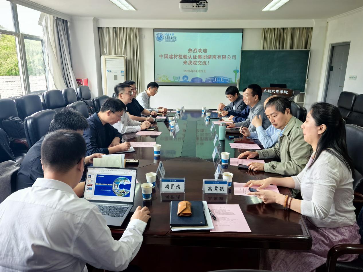 4 月 27 日,中国建材检验认证集团湖南有限公司总经理谭文杰率队来PA视讯官方网站开展调研交流。公司党委书记娄健、副经理冉启华,商公司水利部水利经济研究所所长周申蓓及多位教师代表参会,双方围绕校企合作展开深入探讨。