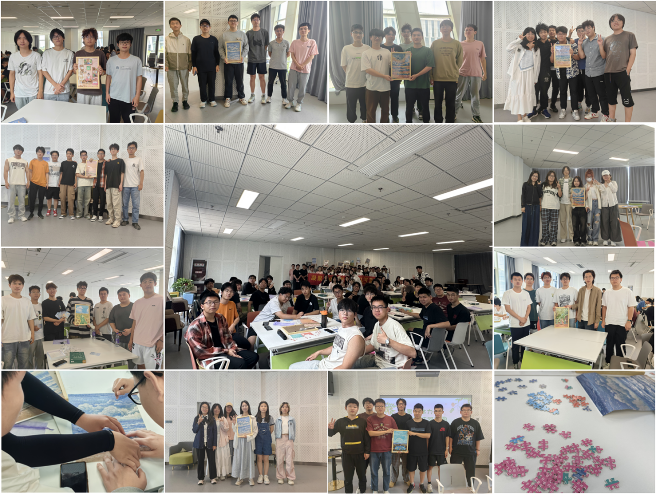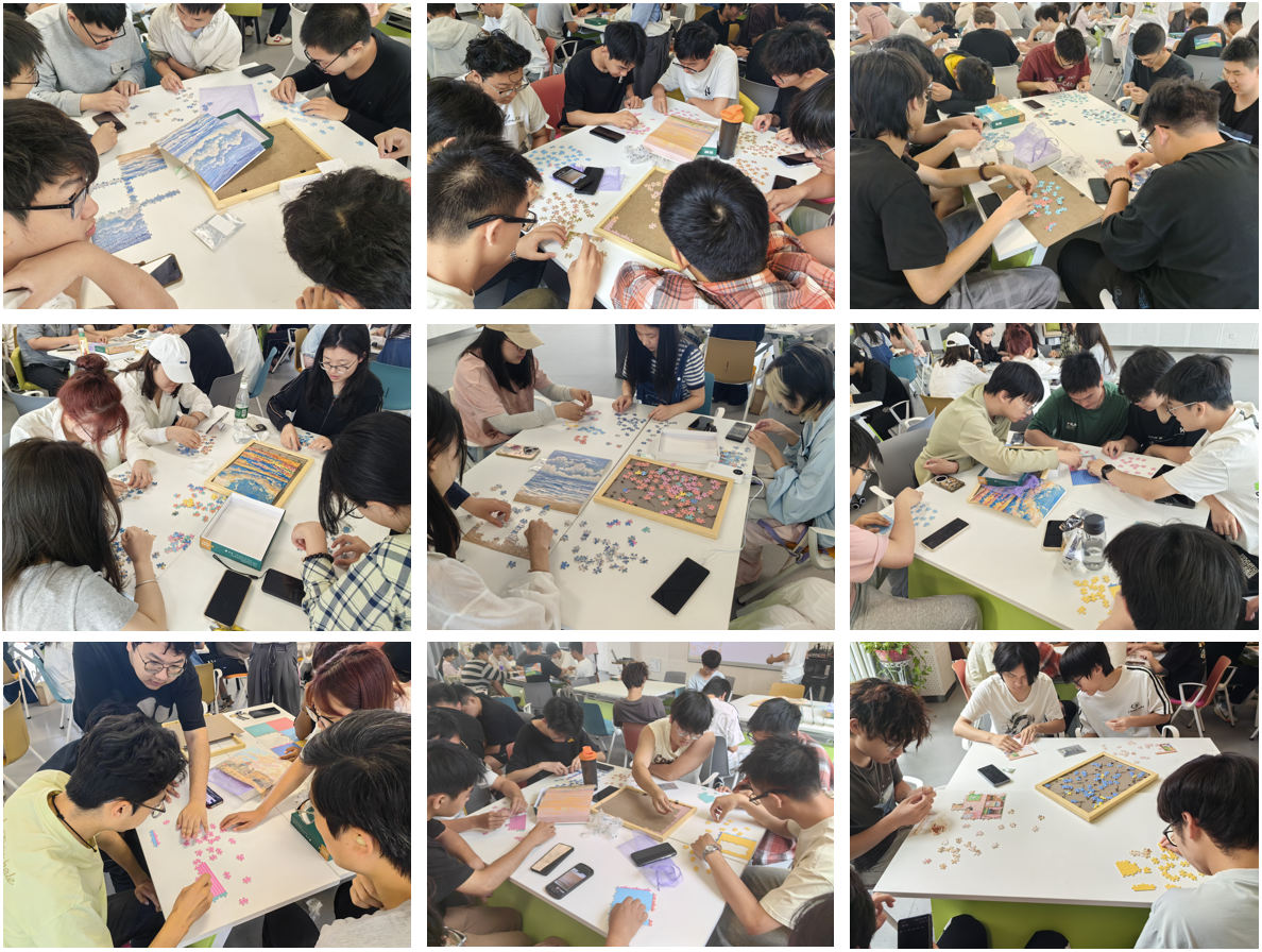 公司的心理委员们组织各组同学进行拼图活动,小组内的各个同学齐心协力,将一片片碎片拼接成一幅美丽的作品。拼图过程中,成员相互交流、分工协作,有人负责找边框、有人分类颜色、有人尝试拼接。这种互动促进了有效的沟通与合作意识,帮助个体理解如何在团队中发挥自己的作用,增强了同学们的团队合作与沟通能力。最后,优先完成拼图的小组成员自发的帮助其他的小组完成拼图,大家共同完成,与自己的作品合影留念。