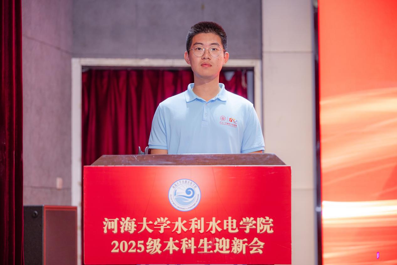 新生代表2025级水利水电工程专业李彦德同学代表全体新生发言,讲述了自己选择河海的历程,围绕大学规划,表达了对未来校园生活的展望。作为建校110周年之际的新生,他表示将与师生共同努力,为PA视讯官方网站再谱新章。