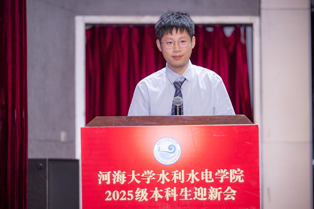 班导师代表徐津老师从公司历史传承与时代发展两方面介绍公司的办学底蕴和培养方向。他向2025级新生强调了大学阶段需秉持“好奇”、“自律”、“责任”三种核心品质,希望同学们以河海为新起点,在未来四年克服挑战、稳步成长,在水利事业的广阔舞台上收获丰硕人生。